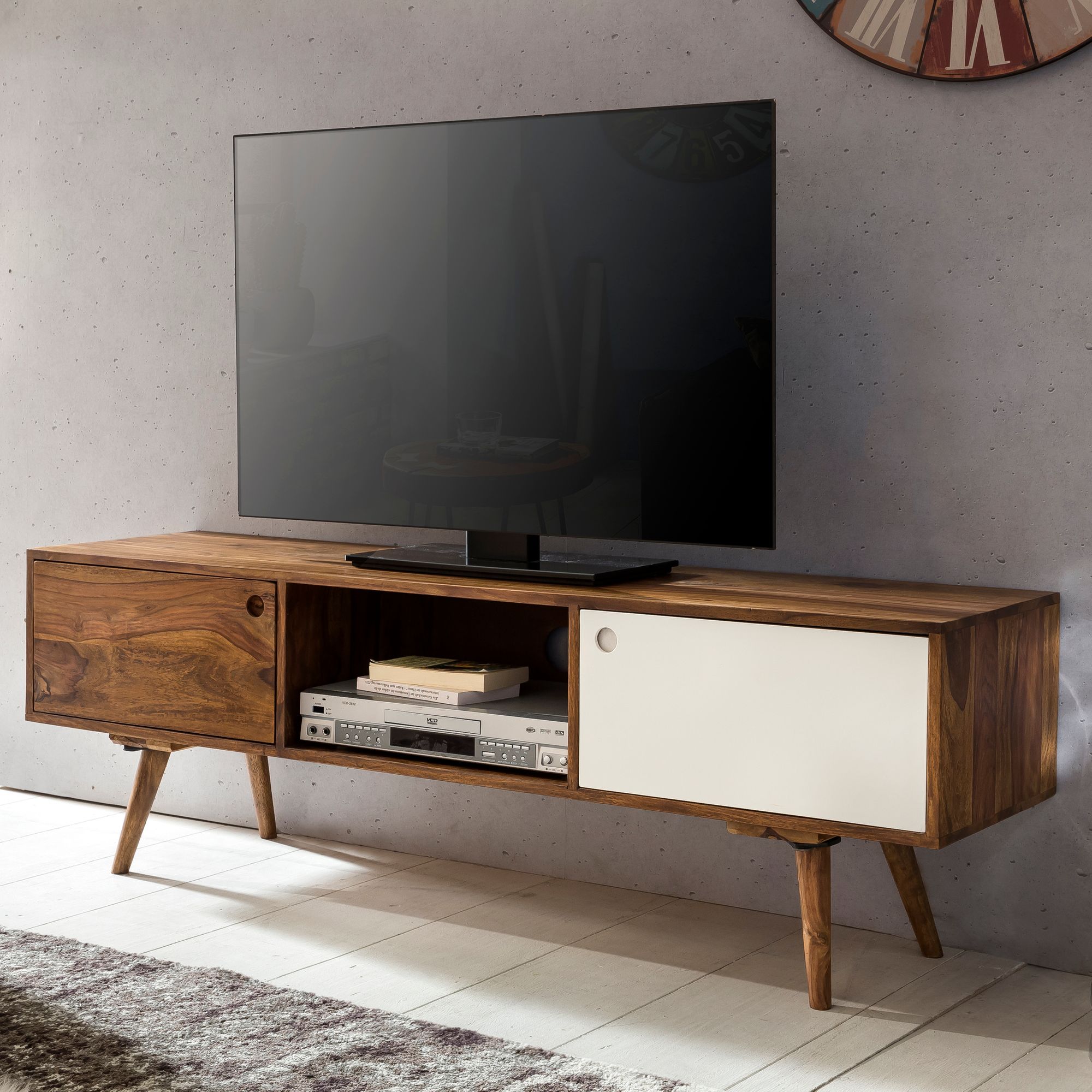 Rack TV REPA 140 cm | Madeira maciça Sheesham | Cor madeira natural & branco | Dimensões 140x45x35 cm