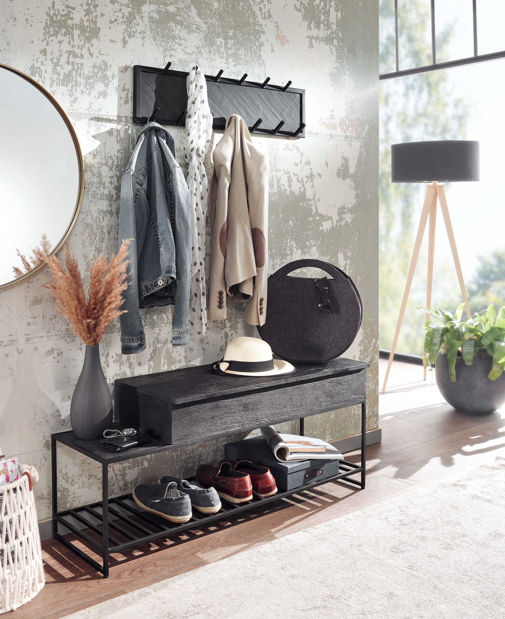 Melhore a sua entrada com este banco combinado com cabide de parede, feito em madeira maciça de manga preta laqueada e ferro pintado a pó resistente, com design industrial moderno. Oferece amplo espaço para sapatos e 13 ganchos resistentes para casacos e acessórios.