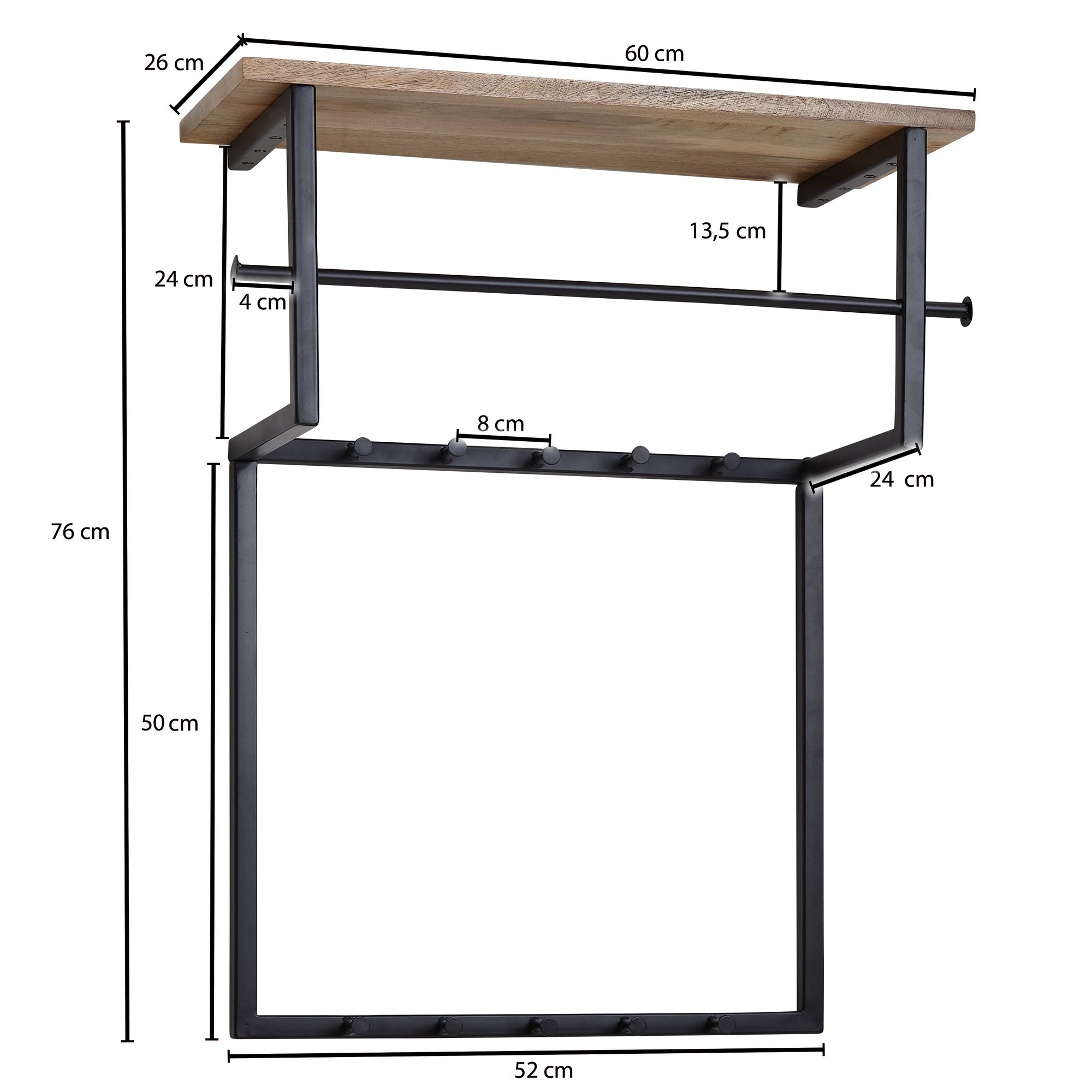 Informações de produto "Cabide de parede de madeira maciça de manga marrom e metal preto | 60x76x26 cm | com 10 ganchos e prateleira"
