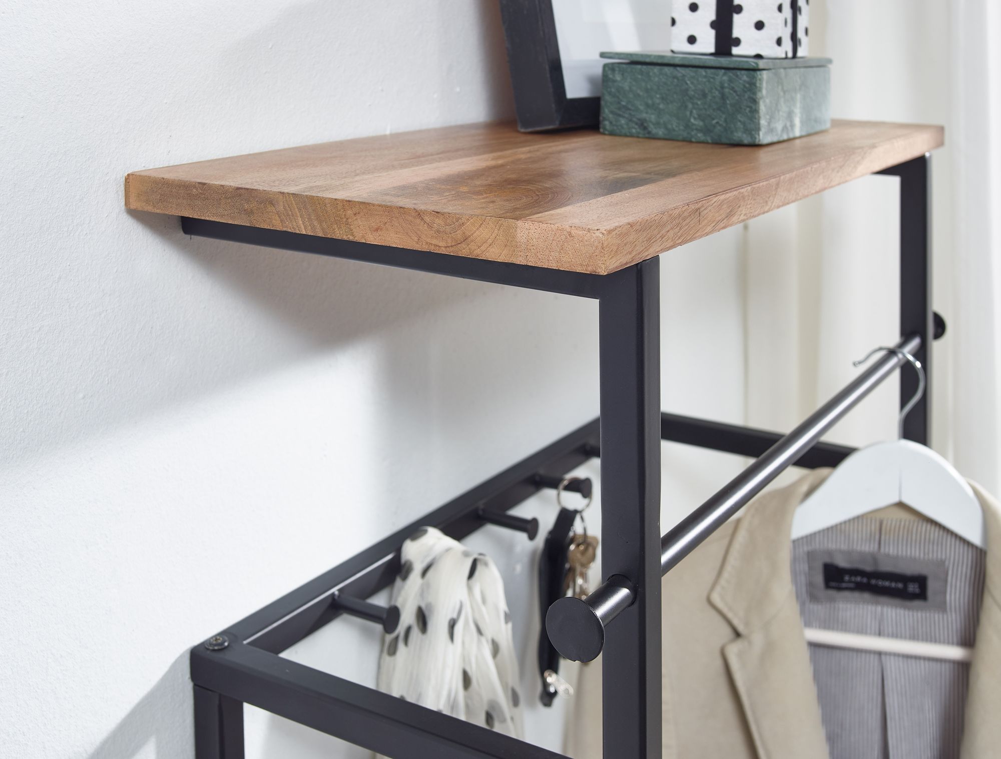 Grande cabide de parede em madeira maciça de manga e metal preto, combinando design refinado com funcionalidade ótima. Conta com dez ganchos robustos, barra para roupas e ampla prateleira.