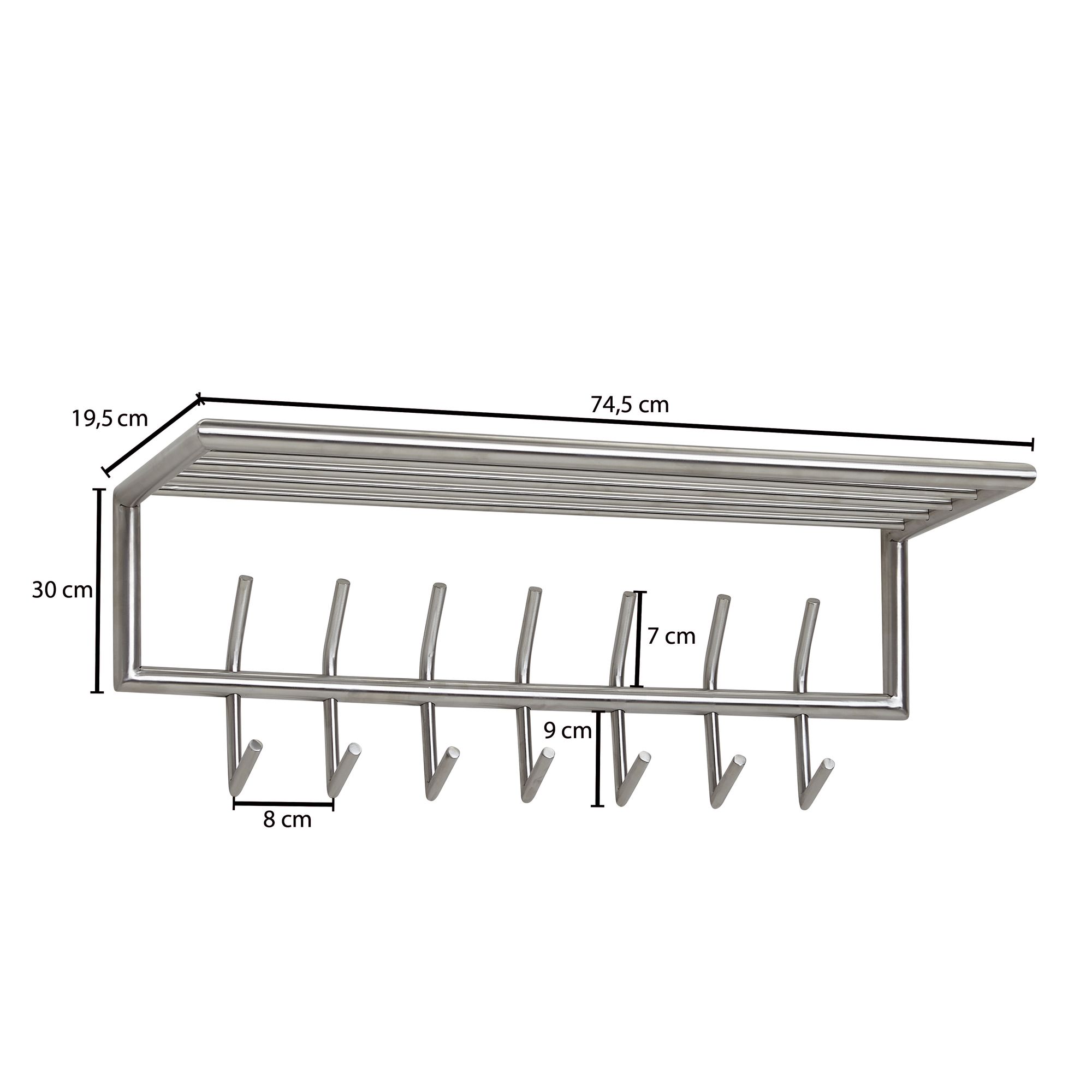 Informações de produto "Cabide de Parede Metal Prateado 74,5x29x30 cm | Aço | 14 Ganchos com Prateleira"