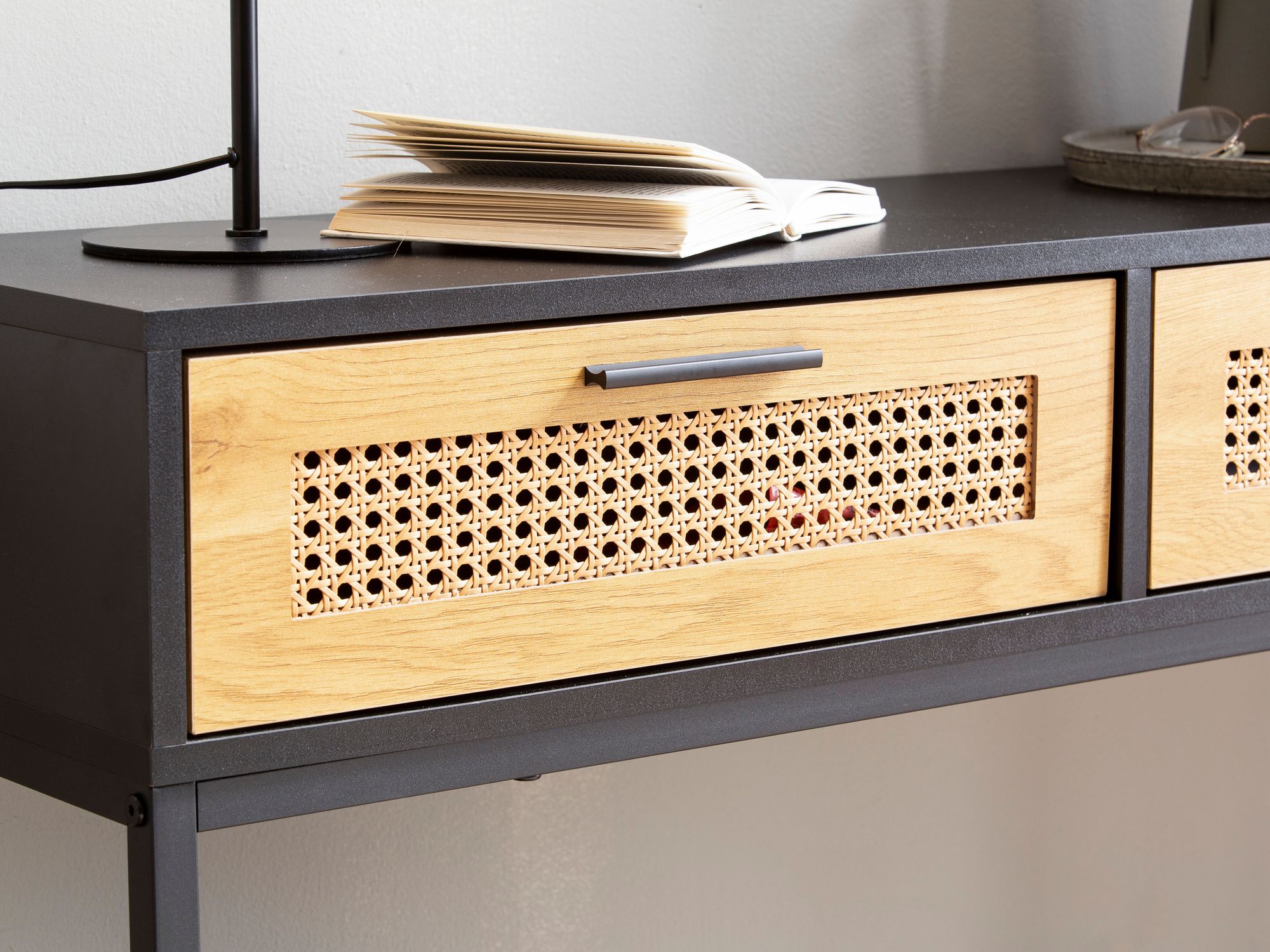 Adicione elegância natural e design intemporal à sua entrada ou corredor com esta consola preta com frentes de gaveta em trançado vienense castanho. Combina estilo e funcionalidade otimizando o espaço.