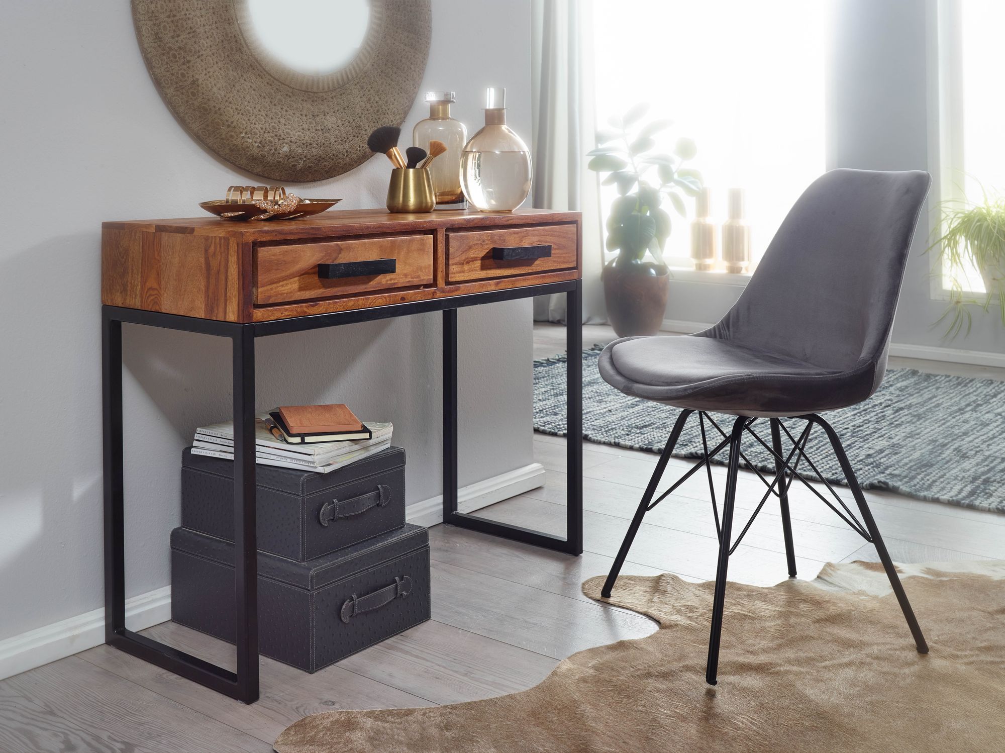 Adicione um toque industrial e elegante à sua casa com esta mesa consola em madeira maciça de Sheesham com estrutura metálica preta. Compacta e funcional, dispõe de duas gavetas espaçosas com deslizes completos e travões giratórios, ideais para organizar seus essenciais na entrada ou sala.