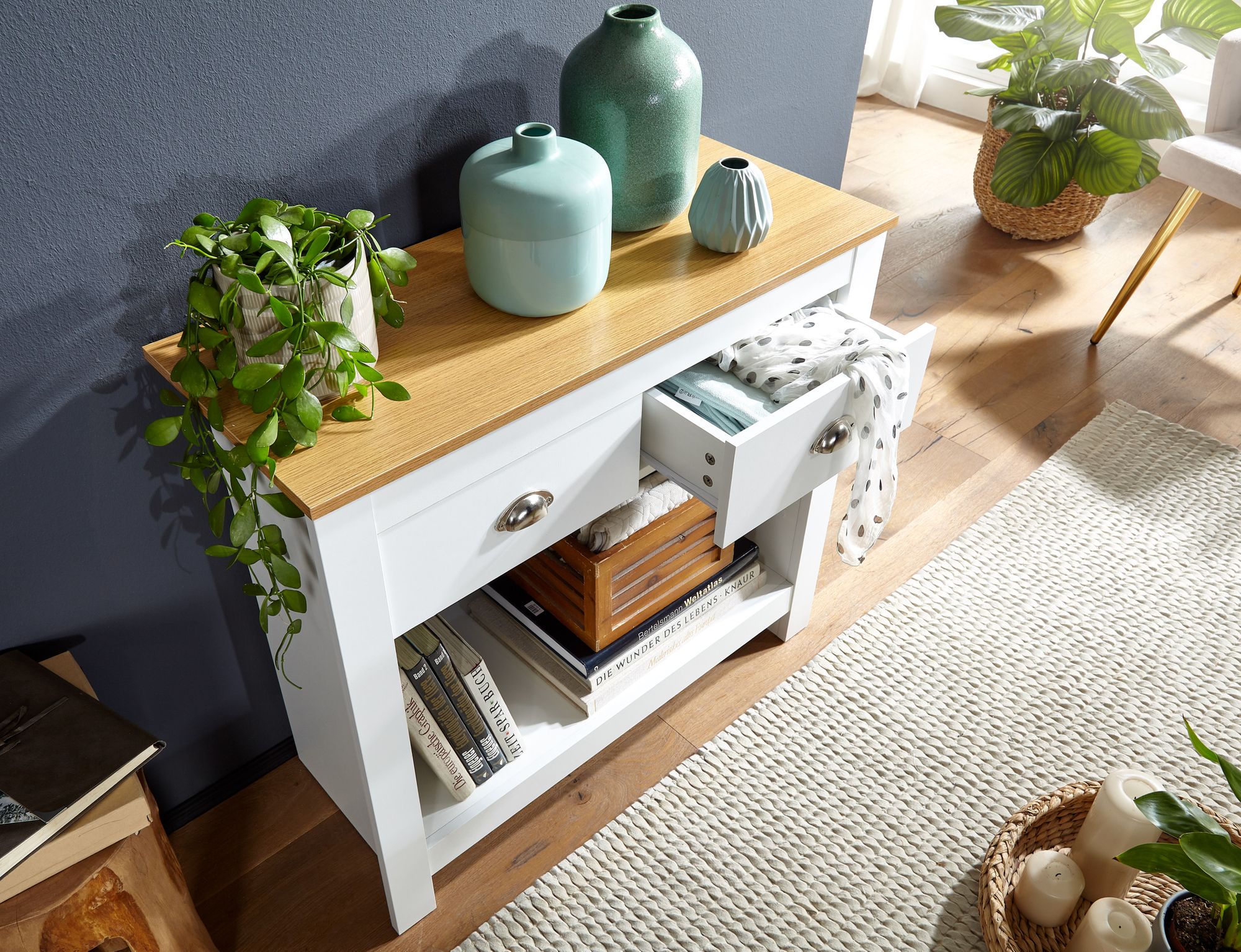 Mesa de consola moderna que combina design e funcionalidade, com duas gavetas espaçosas e uma prateleira aberta para armazenamento ótimo. A superfície em carvalho adiciona calor, enquanto a estrutura branca ilumina qualquer área.