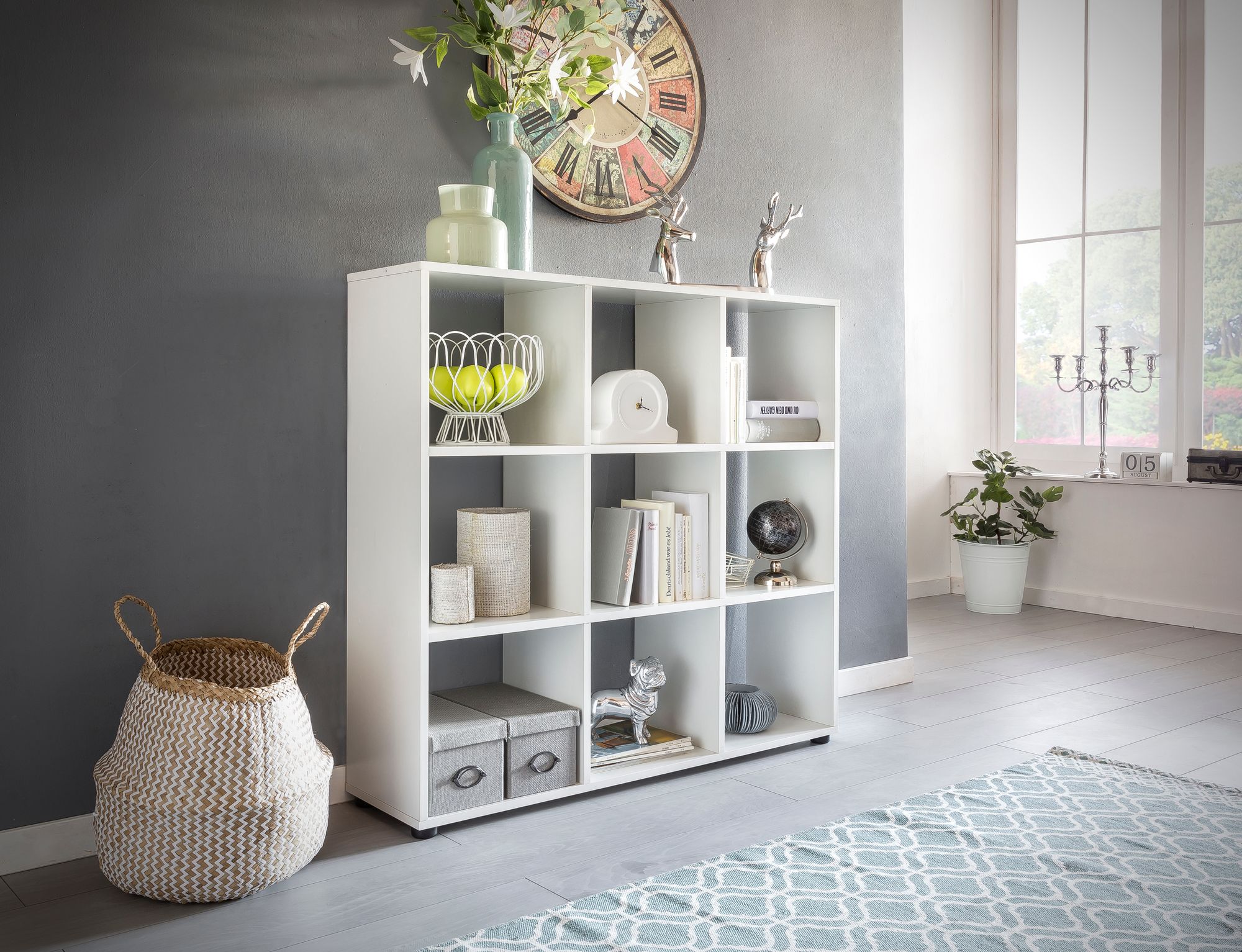 Esta estante de design branco combina estética moderna com funcionalidade num móvel elegante. Oferece 8 compartimentos espaçosos para livros, pastas e objetos decorativos. Feita em aglomerado melaminado branco com pés pretos foscos, serve tanto como estante independente como divisor de ambientes.