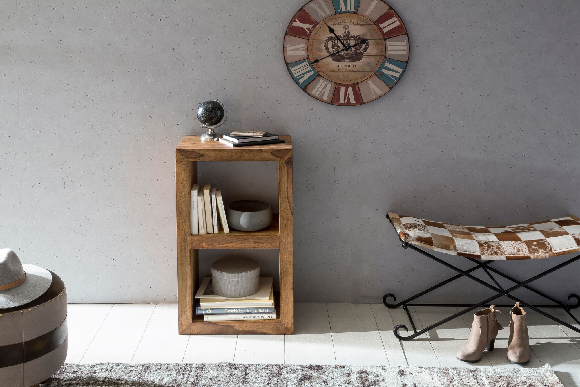 Estante em madeira maciça Sheesham com design natural e elegante, ideal como mesa auxiliar, móvel de arrumação ou pequena mesa de centro. A forma reta e as 2 prateleiras oferecem versatilidade e praticidade.