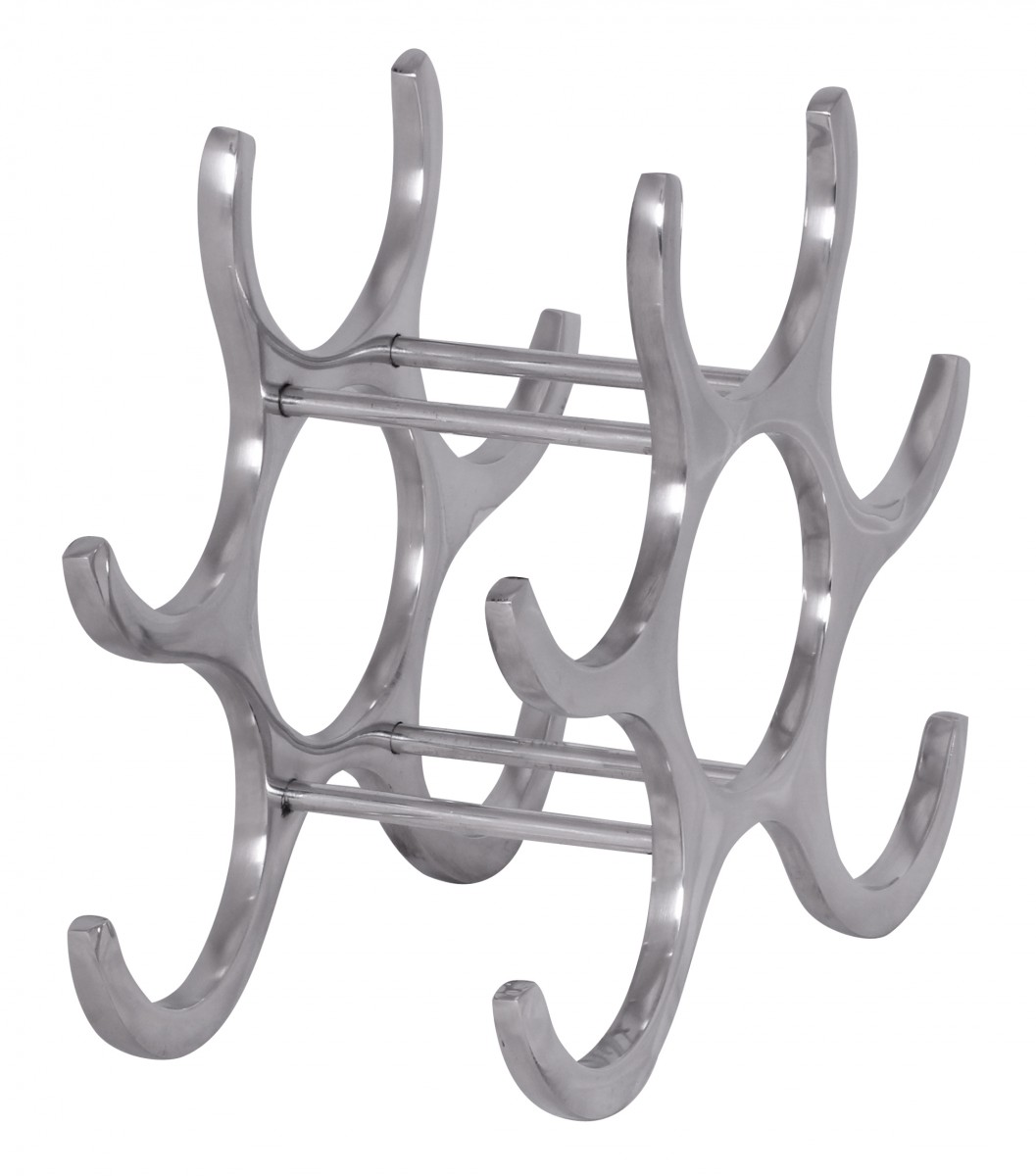 Otimize seu espaço com este suporte de vinho design em alumínio prateado com capacidade para 6 garrafas. Combina elegância e funcionalidade, ideal para cozinhas modernas ou salas de jantar.