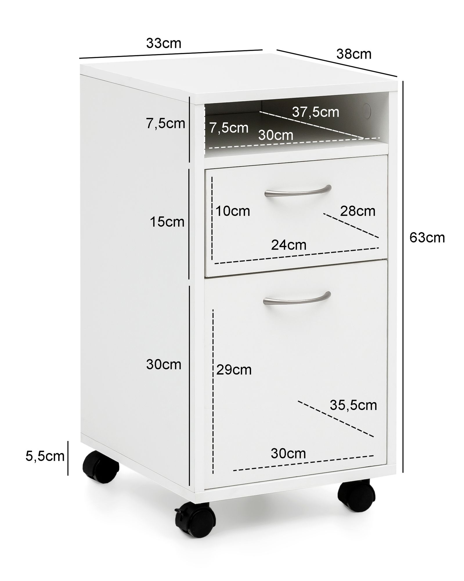 Informações de produto "Gaveteiro com Rodas Branco | 33x63x38 cm | Painel Melamínico e Plástico"