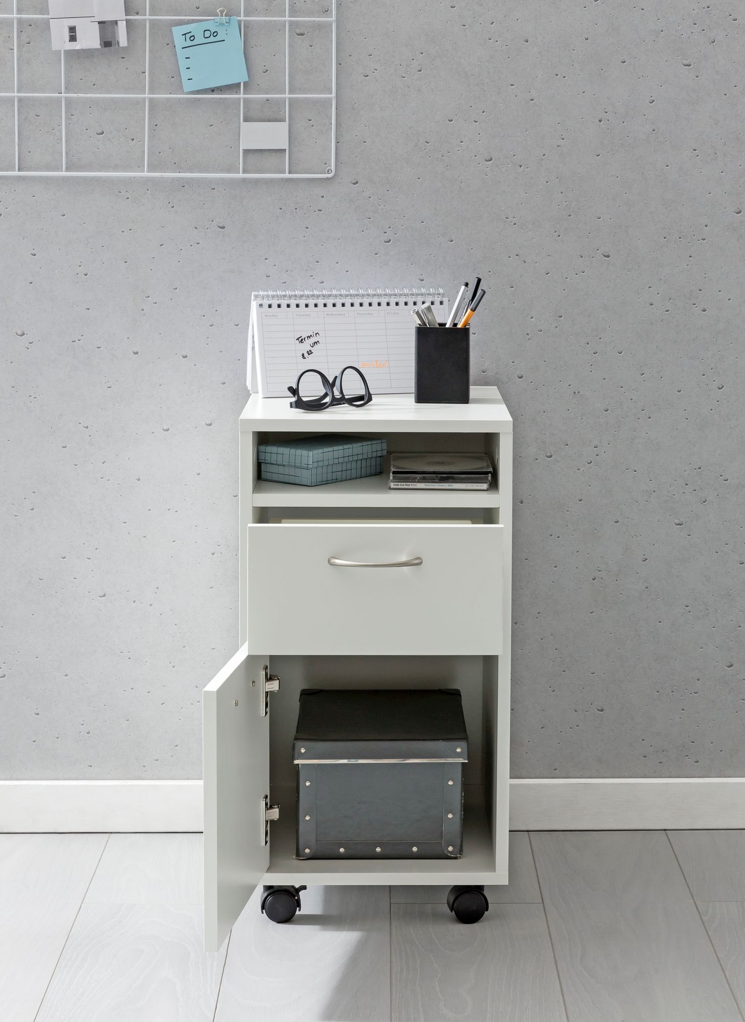 Com dois compartimentos, uma porta e gavetas, oferece armazenamento otimizado. Rodas com freios garantem estabilidade quando parado. A superfície melamínica é resistente a riscos e água.
