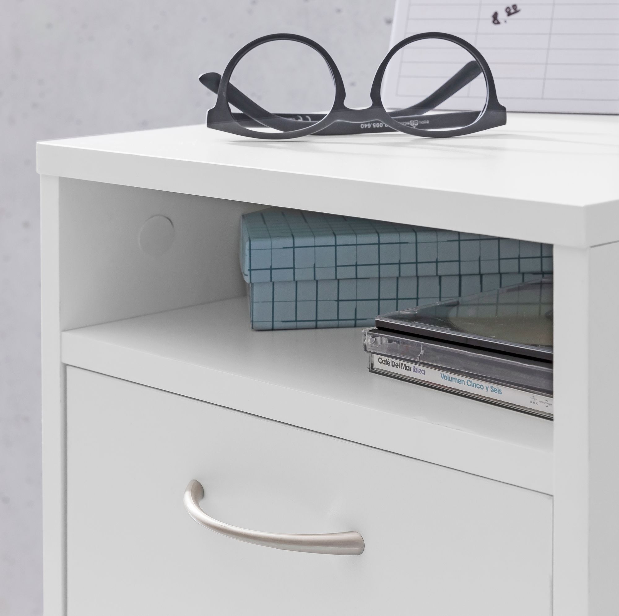 Este gaveteiro com rodas branco combina design moderno e funcionalidade. Linhas limpas, puxadores prateados e rodas pretas discretas o tornam ideal para escritórios ou espaços de trabalho.