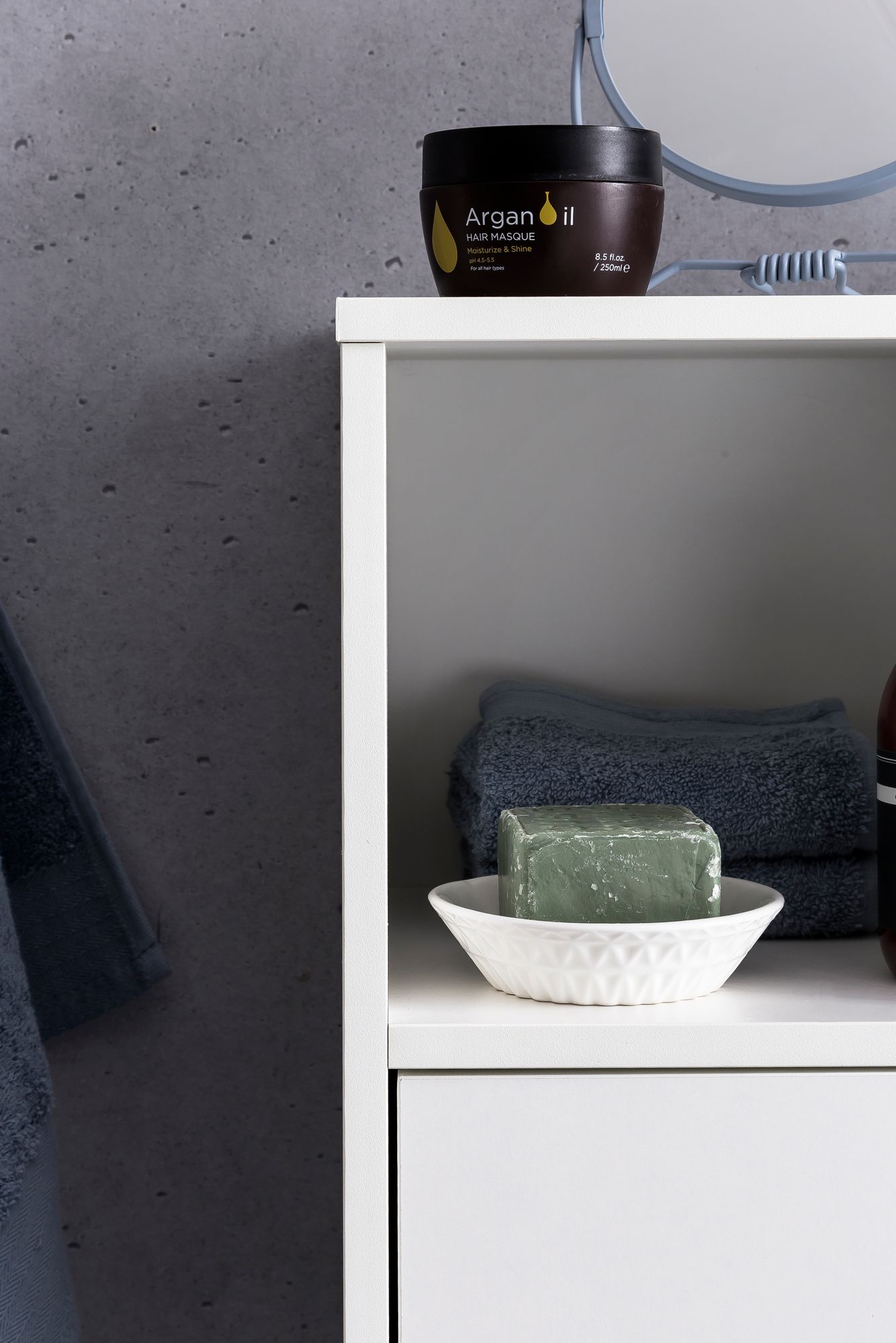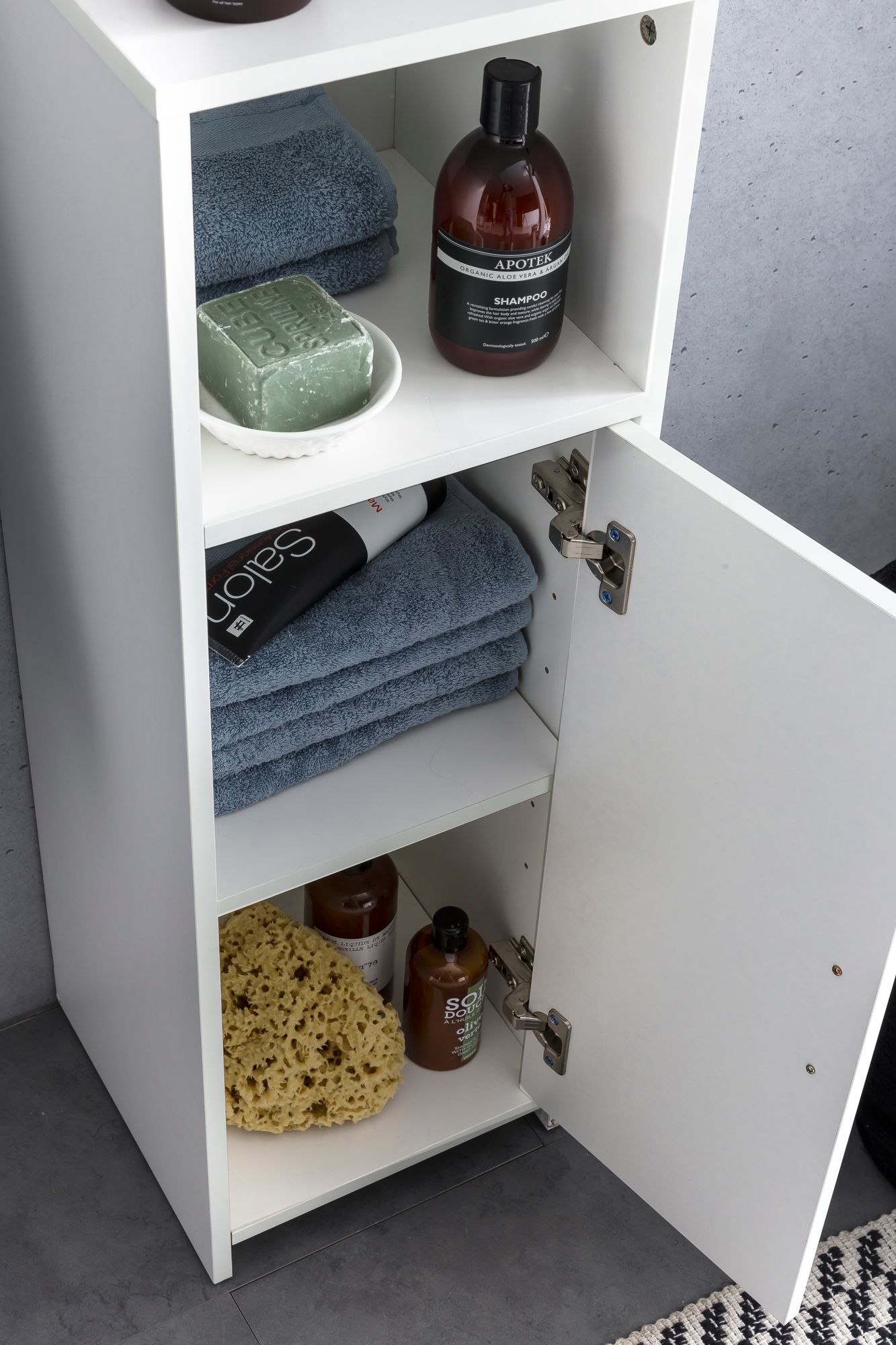Este armário de banheiro branco em madeira apresenta design moderno e intemporal, ideal para espaços pequenos. Inclui uma porta e uma prateleira para armazenamento versátil.