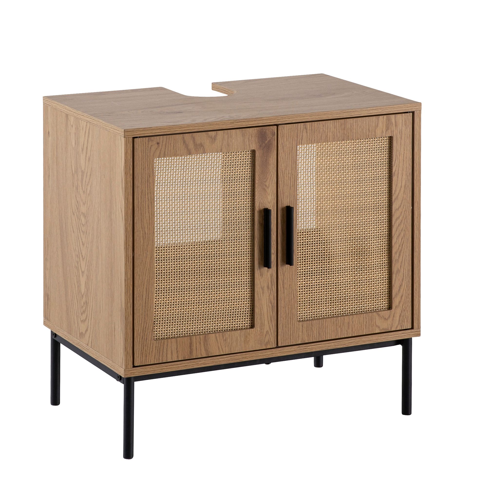 As portas apresentam trançado em vime sintético que confere um toque natural e elegante. Com dimensões compactas de 60x60x40 cm, adequado a casas de banho pequenas. Dispone de dois compartimentos com portas e corte para sifão.