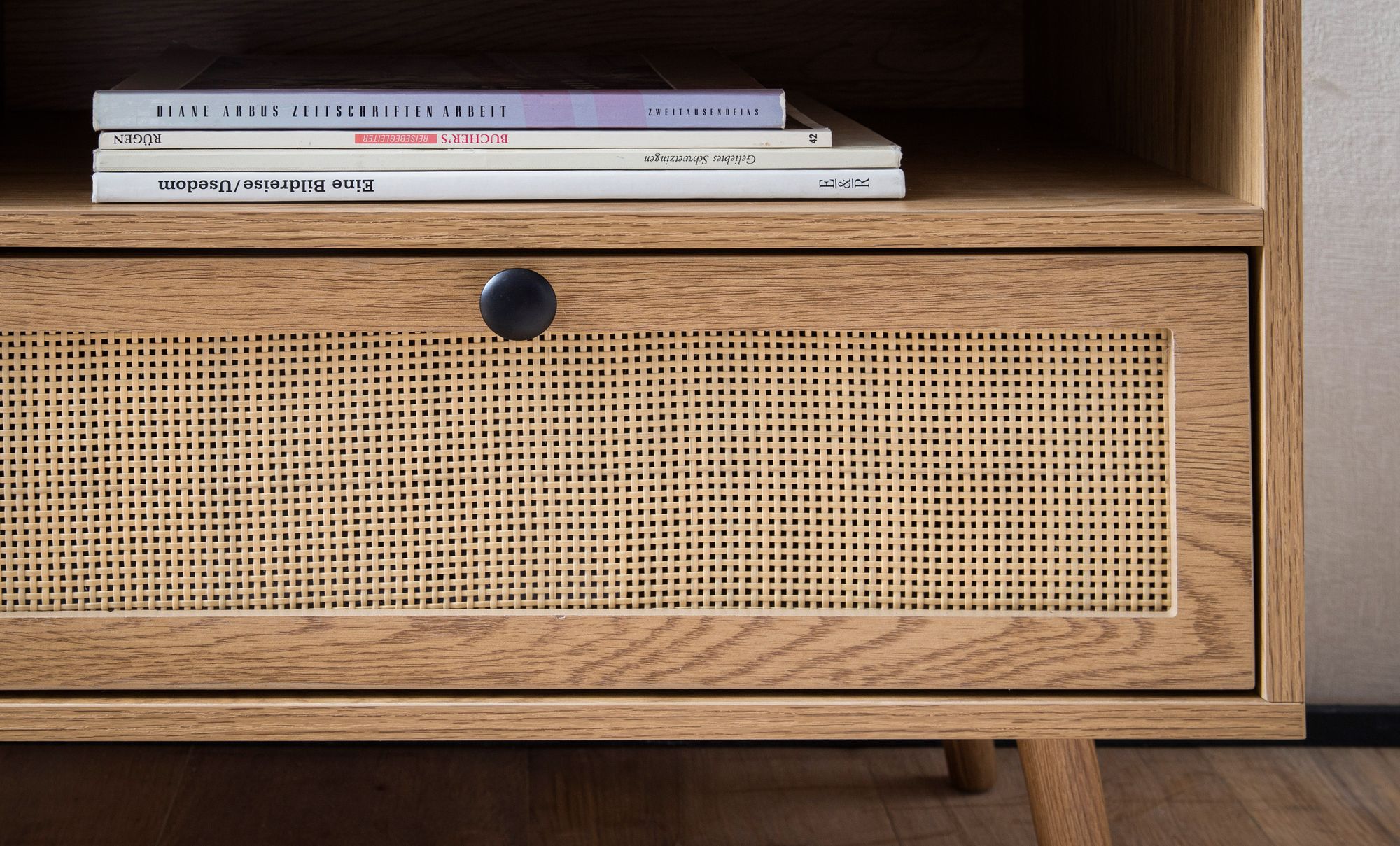 Lowboard 120x56x39 cm em decoração de carvalho e rattan | Móvel TV castanho com puxadores pretos