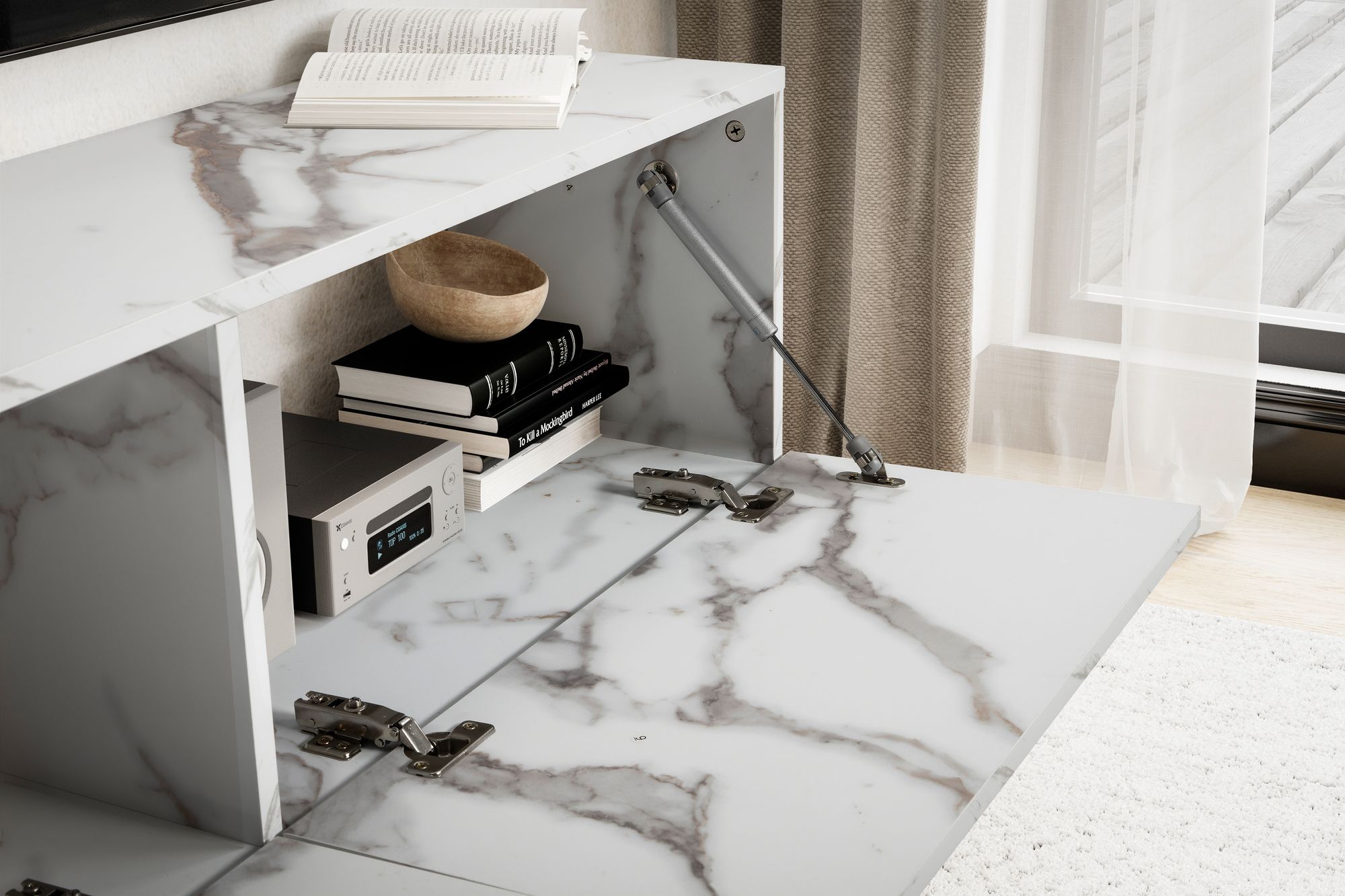 Este lowboard suspenso em MDF com acabamento branco mate efeito mármore confere elegância contemporânea à sua área de TV. Seu design moderno e elegante com superfície retangular oferece amplo espaço para TVs de até 55 polegadas.