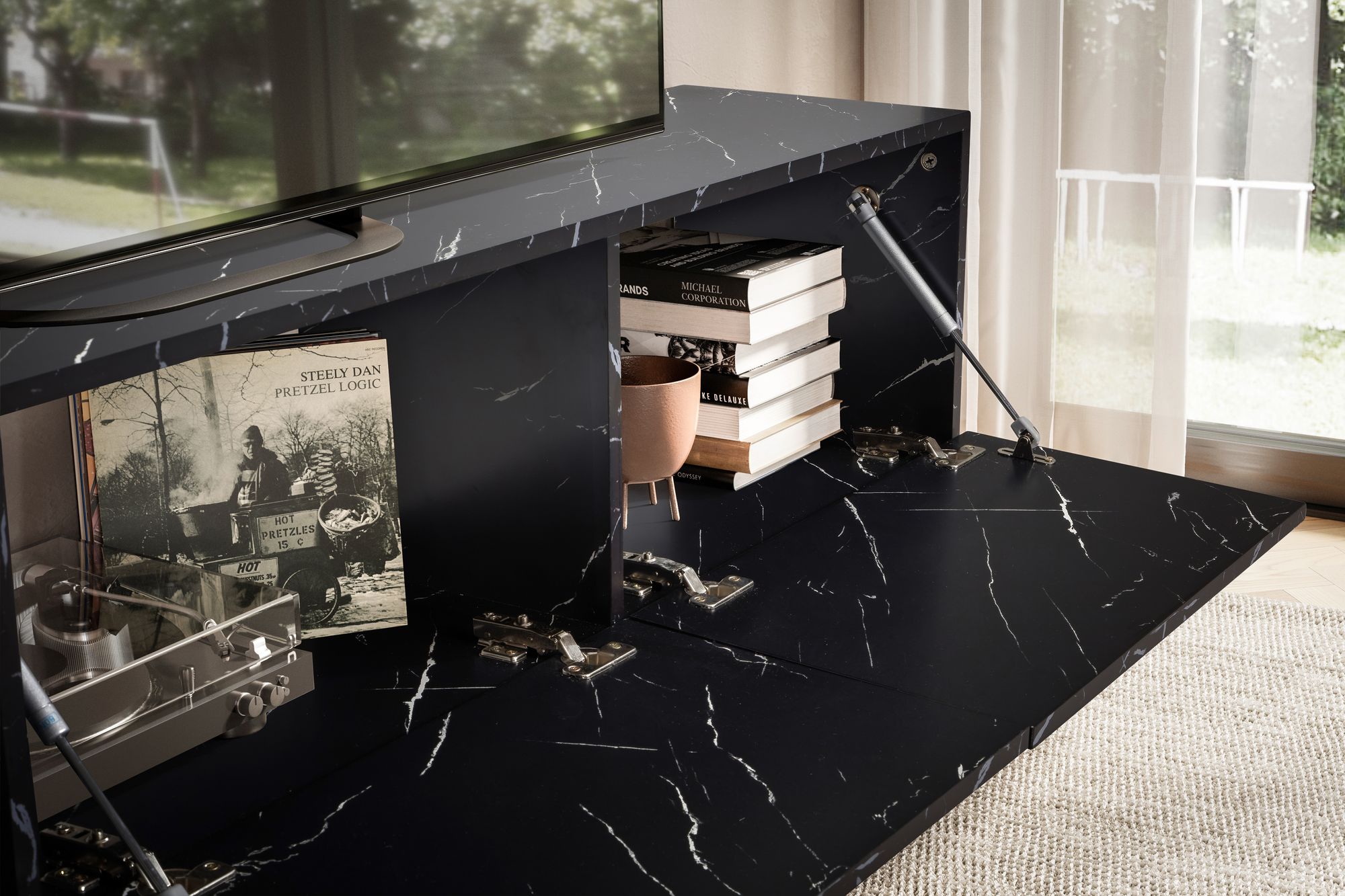 - Portas basculantes para armazenamento discreto de DVDs e consoles