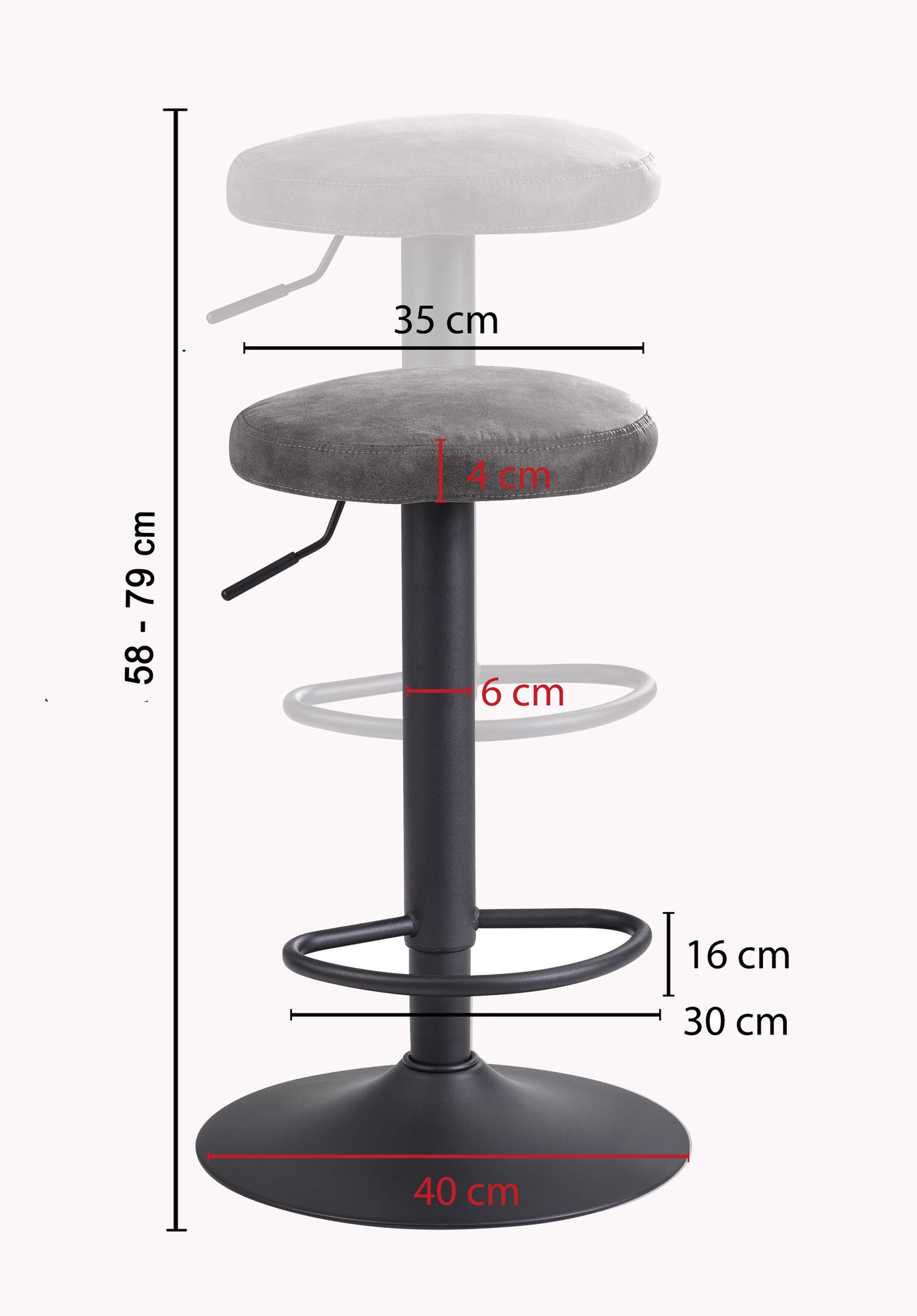 Informações de produto "Banco de bar cinza efeito camurça sem encosto | Metal preto e tecido | 40 x 58-79 cm | Capacidade 100 kg"
