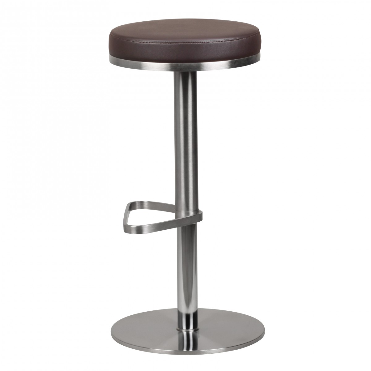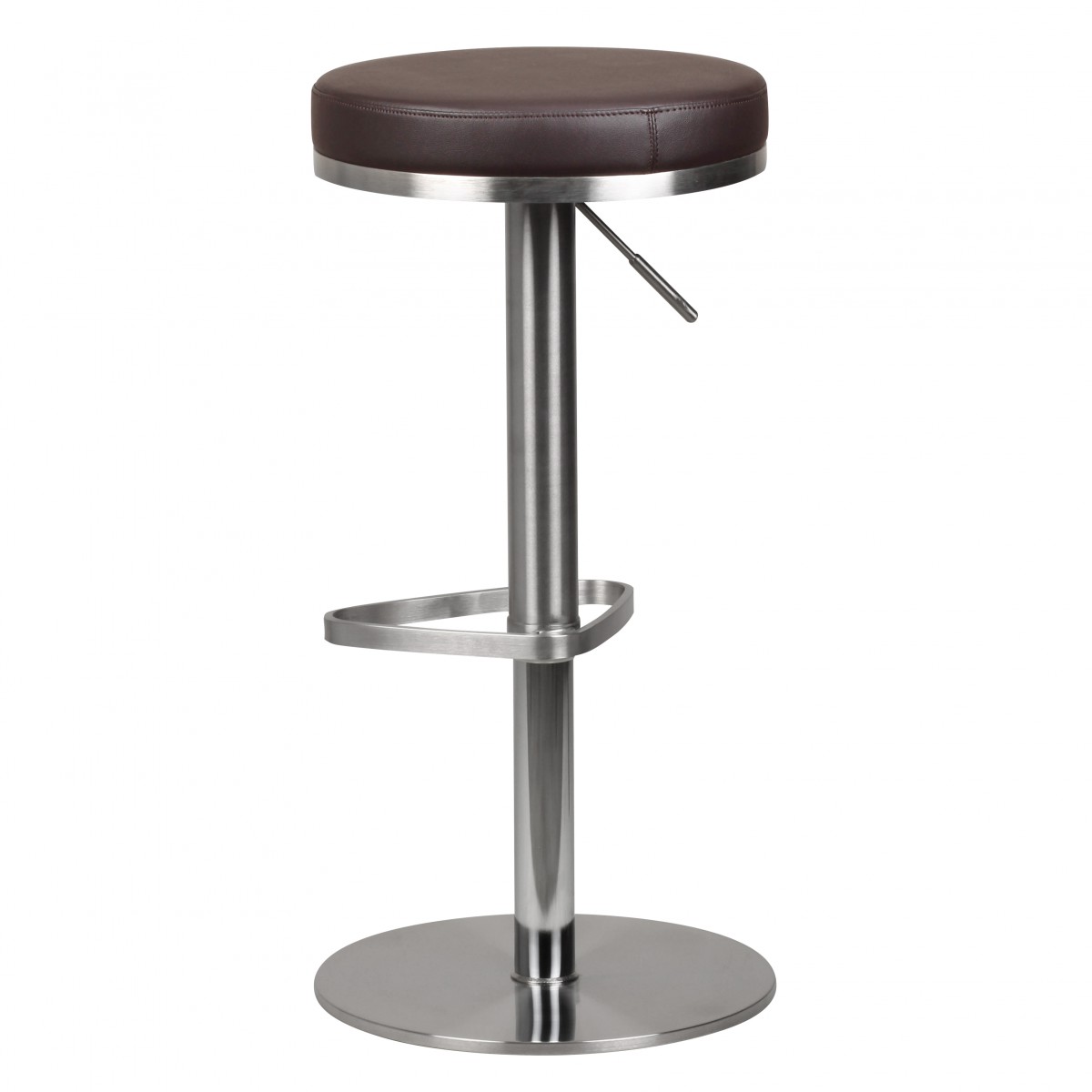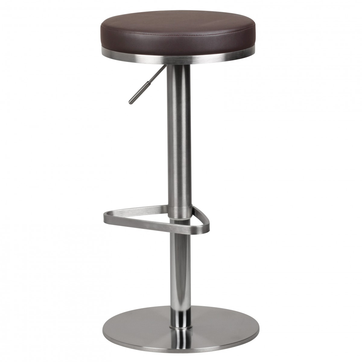 Este banquinho de bar moderno apresenta estrutura em aço inoxidável cromado com assento redondo e almofadado em couro sintético marrom para conforto superior. A altura é ajustável de 57 a 82 cm, permitindo ajuste preciso conforme o tamanho do corpo e espaço.