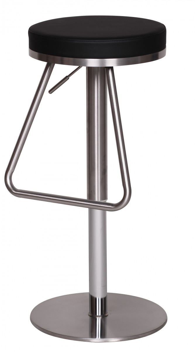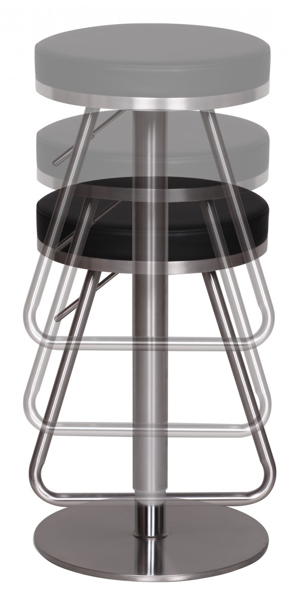 Este banco de bar moderno combina design refinado e conforto ideal com altura ajustável do assento de 54 a 79 cm. O assento redondo e generosamente almofadado em couro sintético preto é enquadrado por um elegante anel de aço inoxidável cromado.