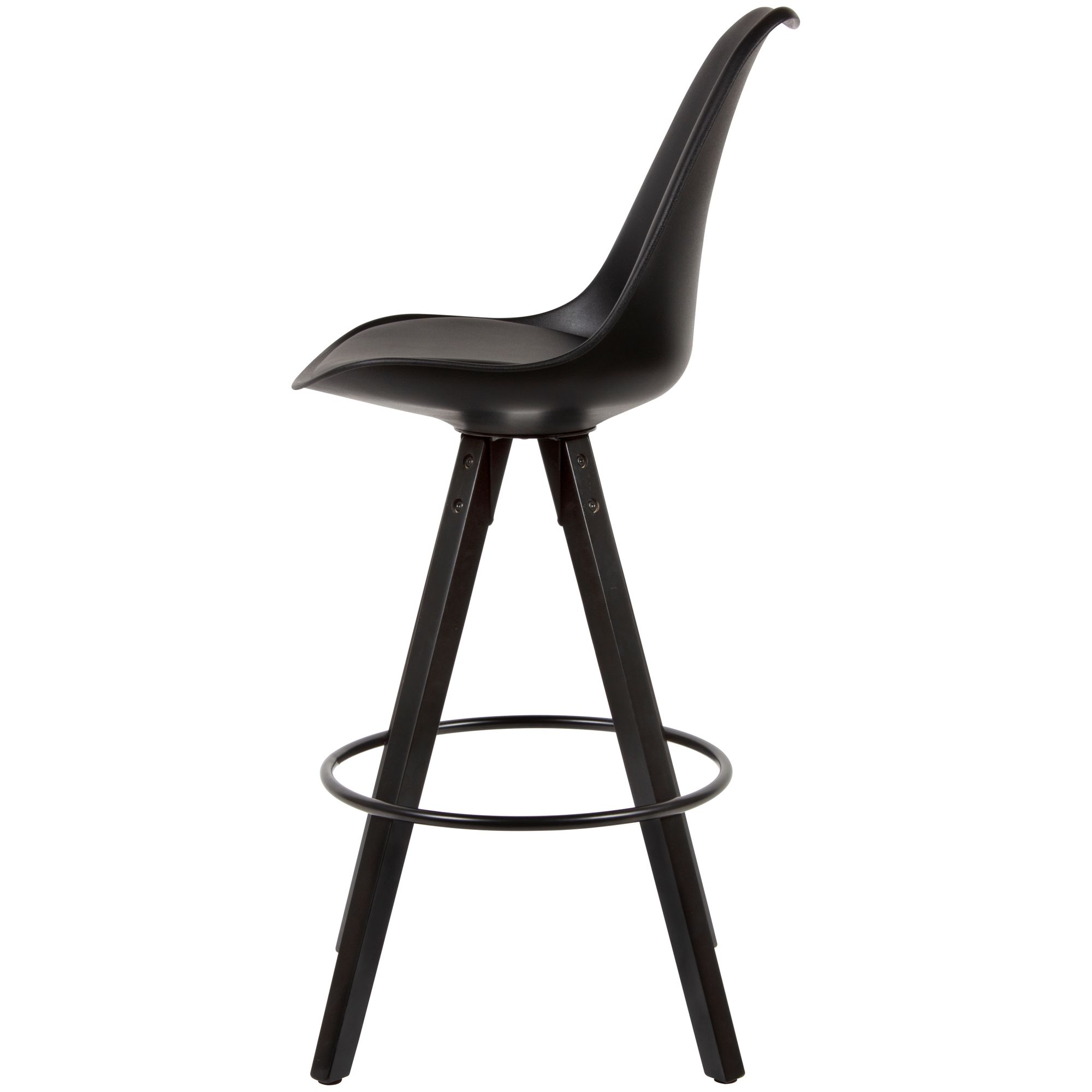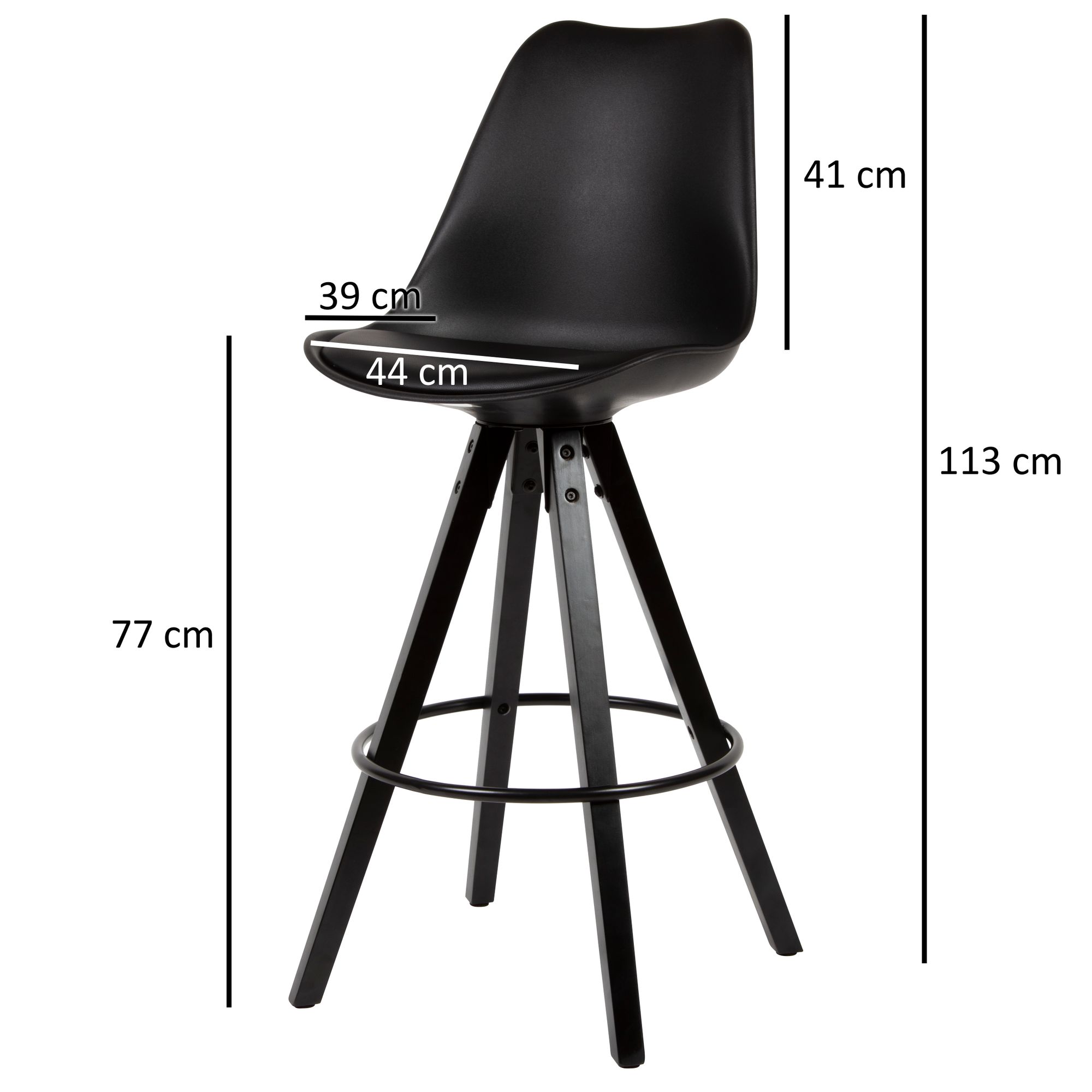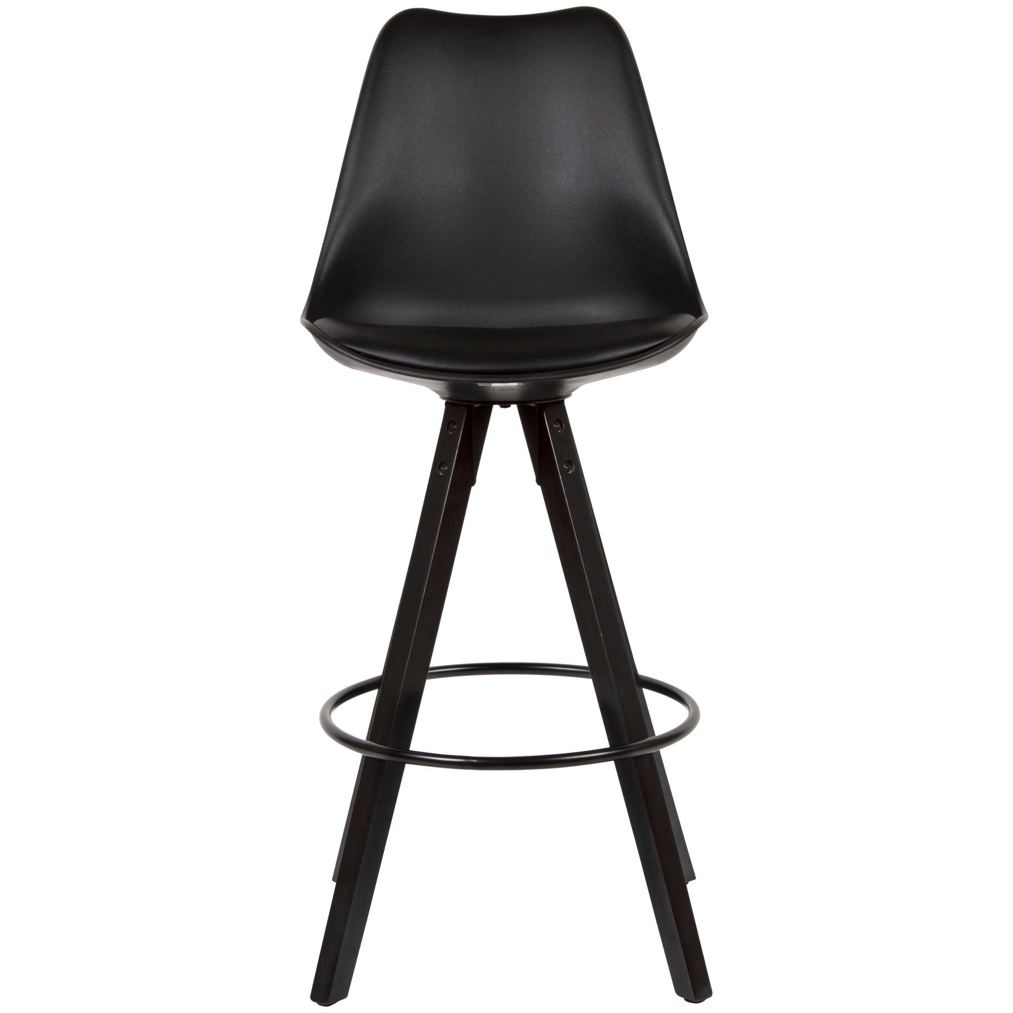 - Materiais: Assento plástico com revestimento em couro sintético, pernas em madeira maciça Hevea preta laqueada, apoio para pés metálico