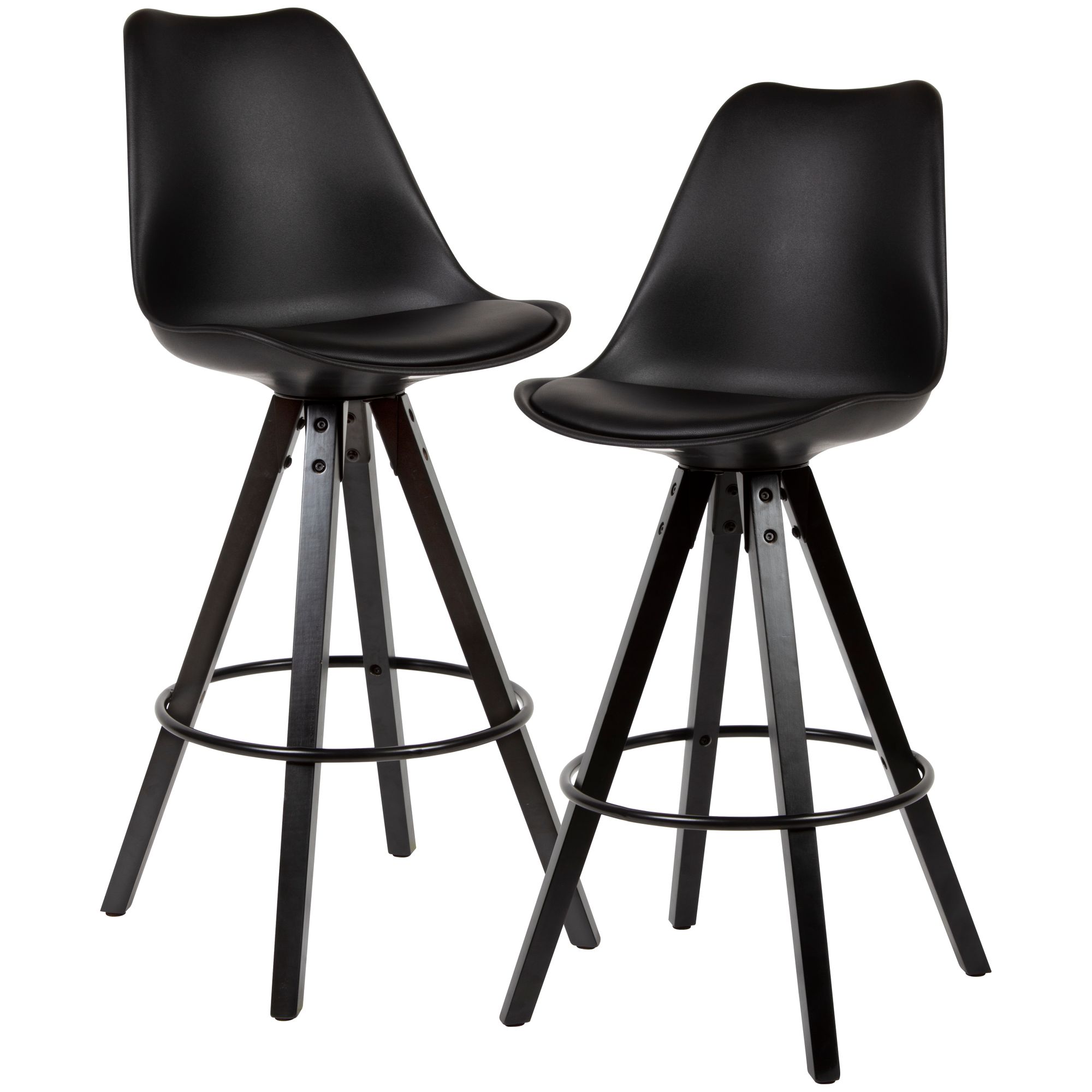 Adicione um toque moderno ao seu bar com este conjunto de 2 banquetas pretas com design escandinavo. O assento e encosto generosamente acolchoados são revestidos em couro sintético para excelente conforto. Pernas em madeira maciça Hevea preta laqueada são complementadas por um anel metálico para apoio dos pés a 30 cm de altura. As pernas inclinadas para fora garantem estabilidade firme e os protetores de feltro evitam riscos no chão.