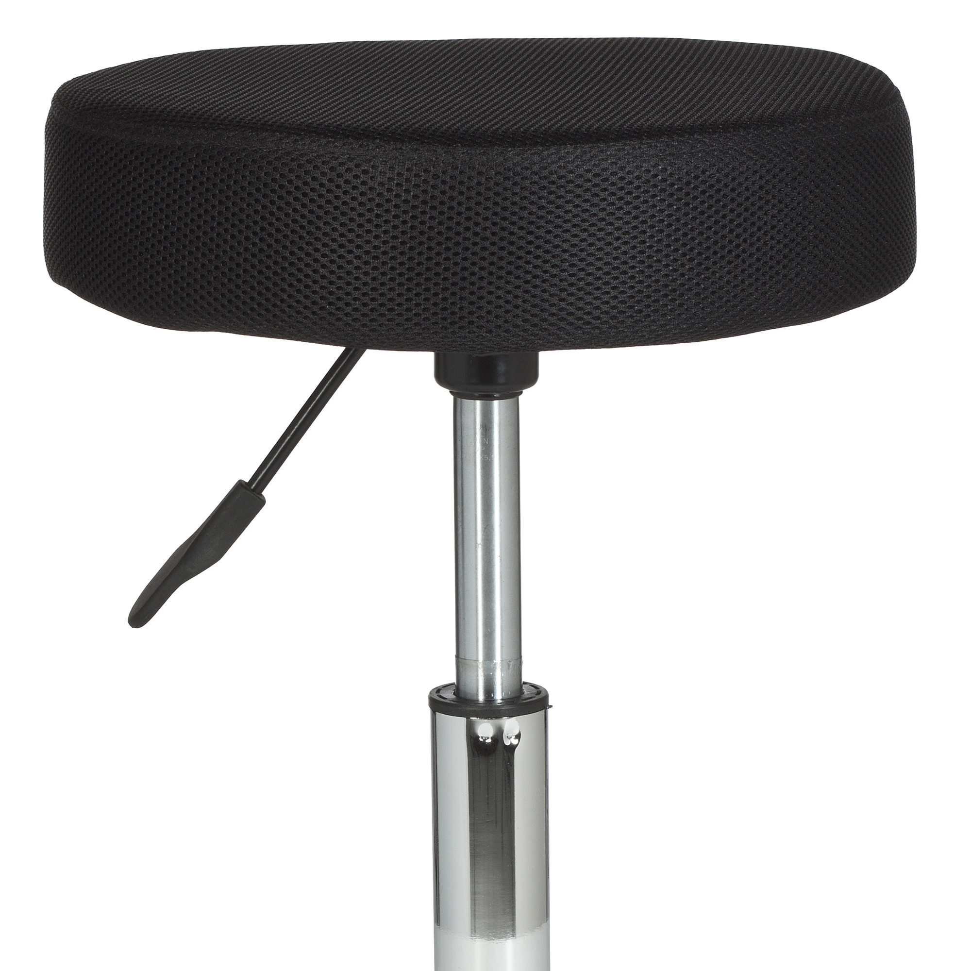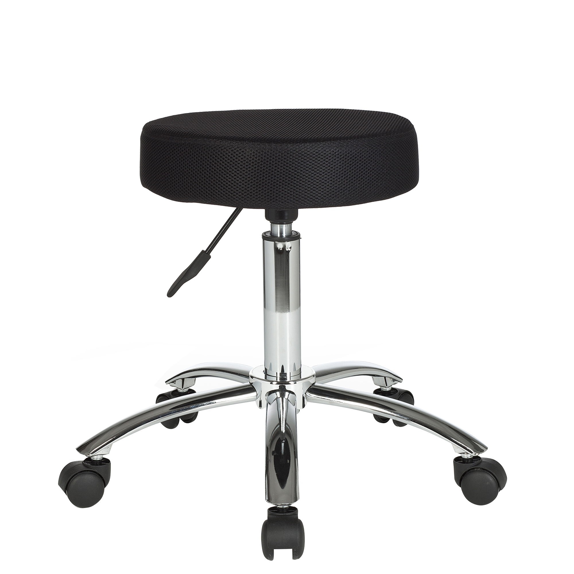 Este banco de trabalho design combina durabilidade e conforto com o assento em malha de tecido preto, acolchoado para uso prolongado. A base em metal cromado oferece estabilidade ideal, enquanto as rodas para tapetes garantem mobilidade fácil. O assento giratório 360° proporciona total liberdade de movimento, perfeito para ambientes profissionais exigentes.
