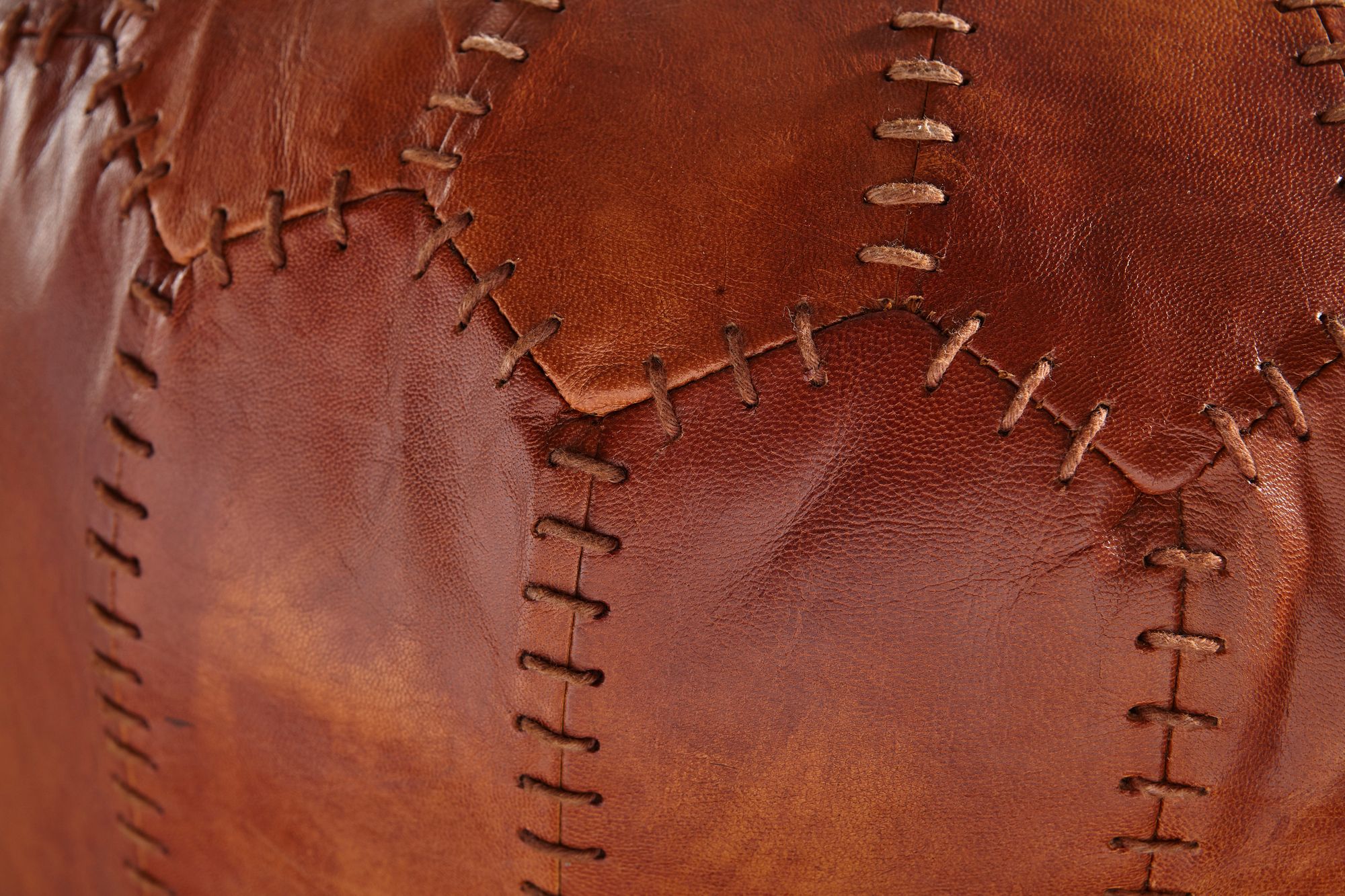 Este banco otomano redondo de design oriental combina estetética tradicional e conforto moderno, estofado em couro genuíno de cabra. As costuras visíveis e grossas realçam o seu estilo único, enquanto o acolchoamento macio garante um assento confortável.