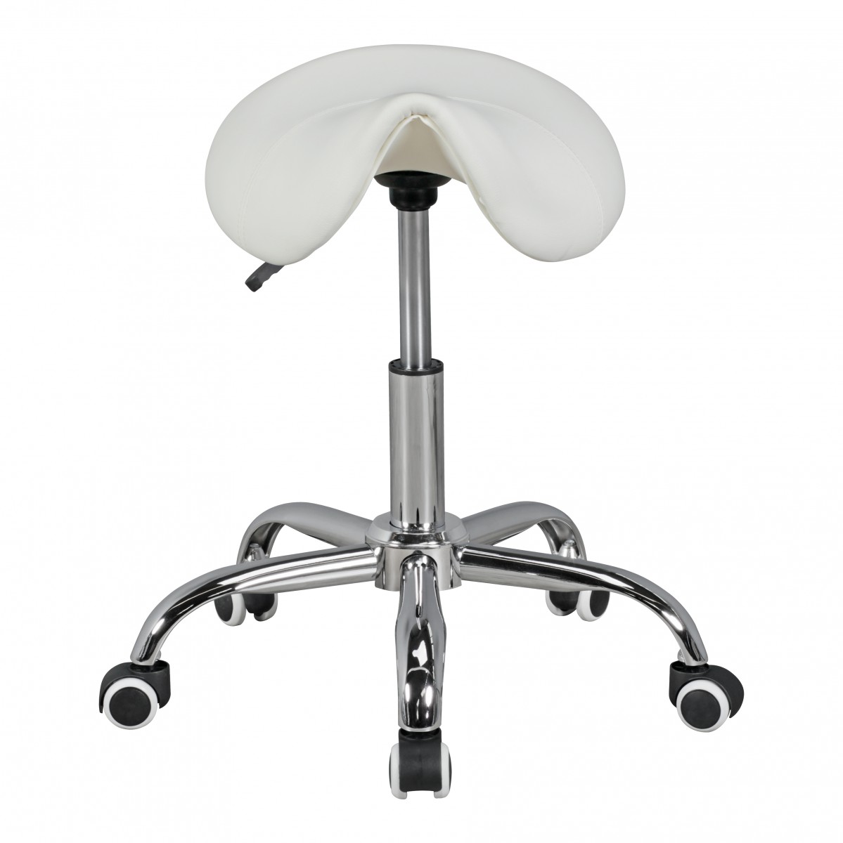 O banco sela MENTON branco combina elegância e conforto com seu assento em couro sintético branco e base robusta de alumínio. Ideal para ambientes profissionais que exigem mobilidade.
