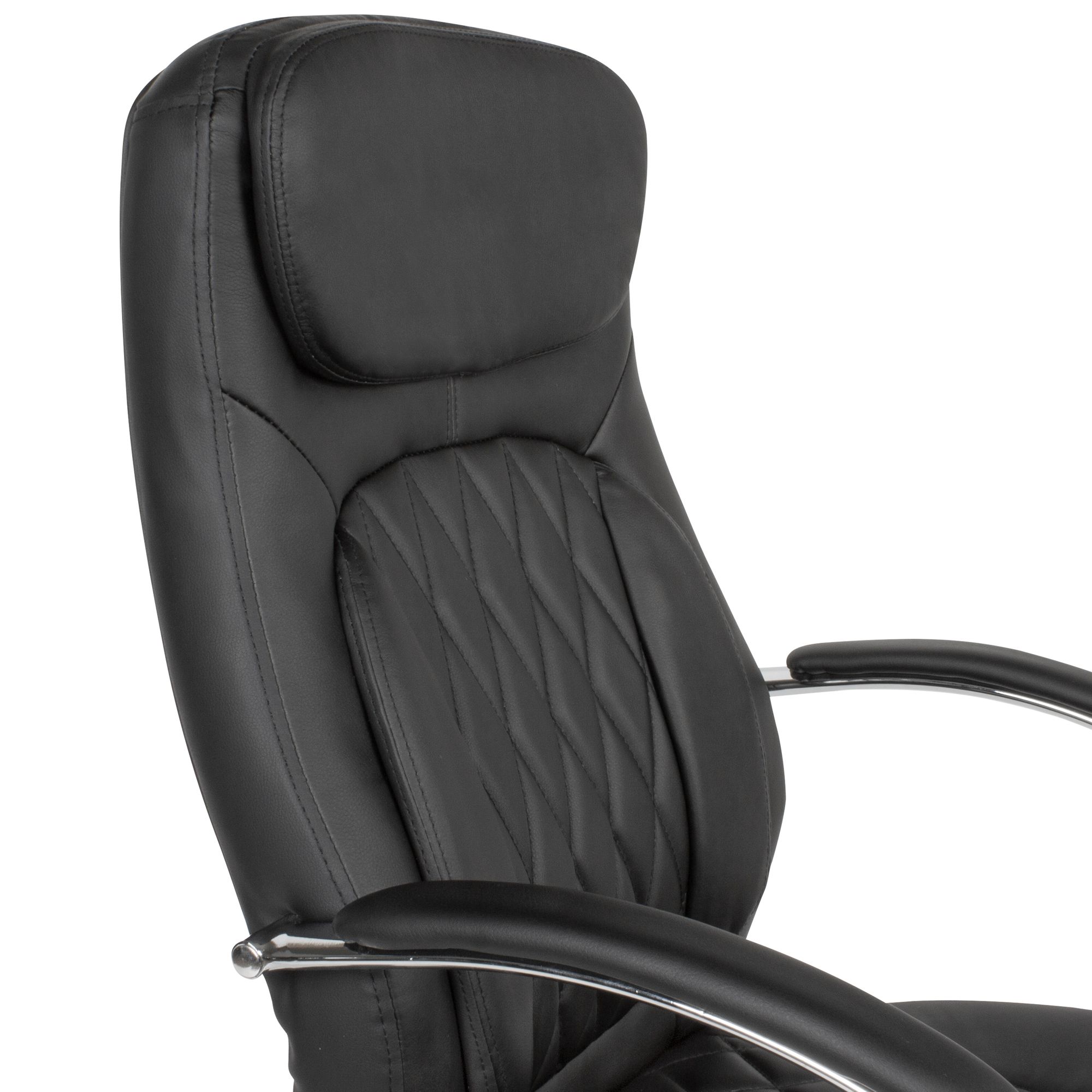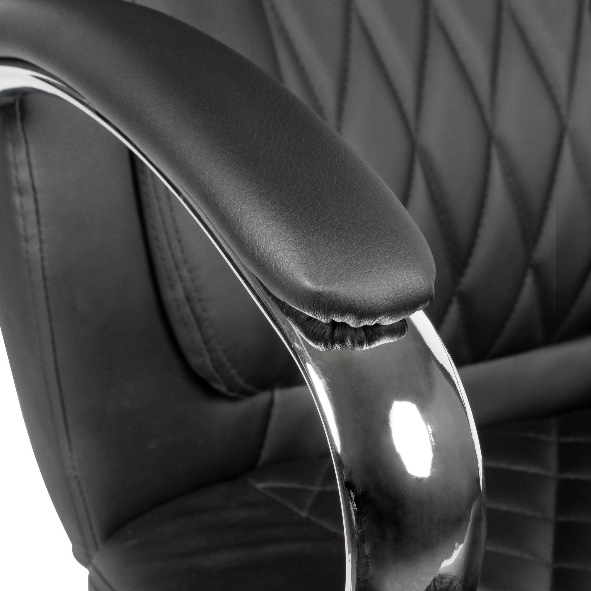 Esta cadeira de escritório em couro sintético preto combina elegância e conforto para uso profissional intensivo. Design moderno com estofamento almofadado em padrão de losangos no assento e encosto para conforto aprimorado. Os apoios de braço e a base larga em aço proporcionam estabilidade, suportando até 120 kg.