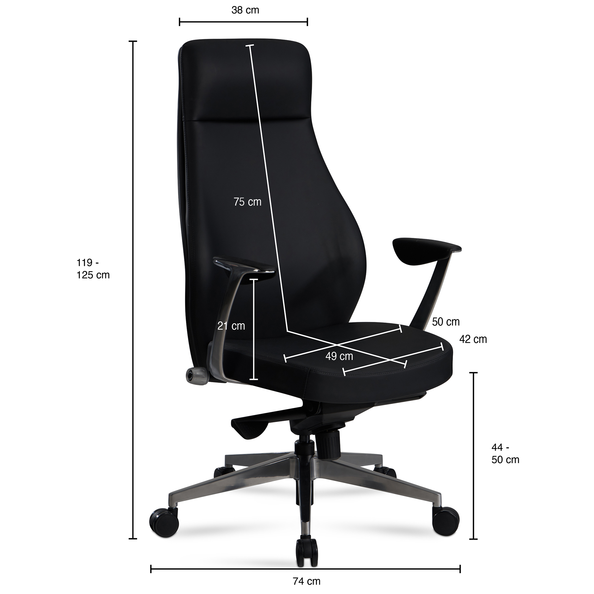 Informações de produto "Cadeira de escritório preta em couro sintético | Design executivo ergonômico | Alt. 119-125 cm Larg. 74 cm Prof. 74 cm"