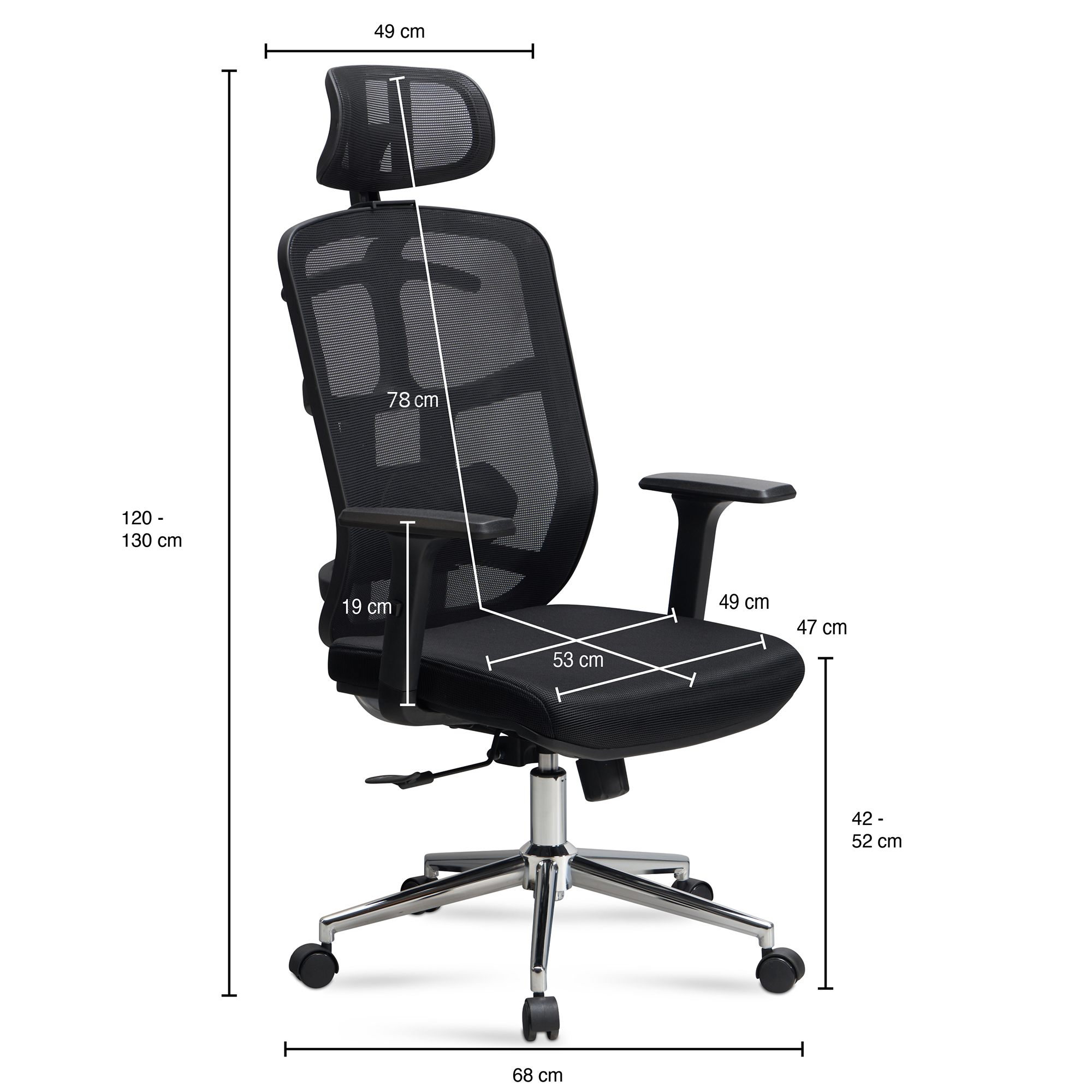 Informações de produto "Cadeira de escritório preta em mesh | Ergonômica com apoio de cabeça e suporte lombar | Dimensões: A 120-130 cm, L 68 cm, P 68 cm"