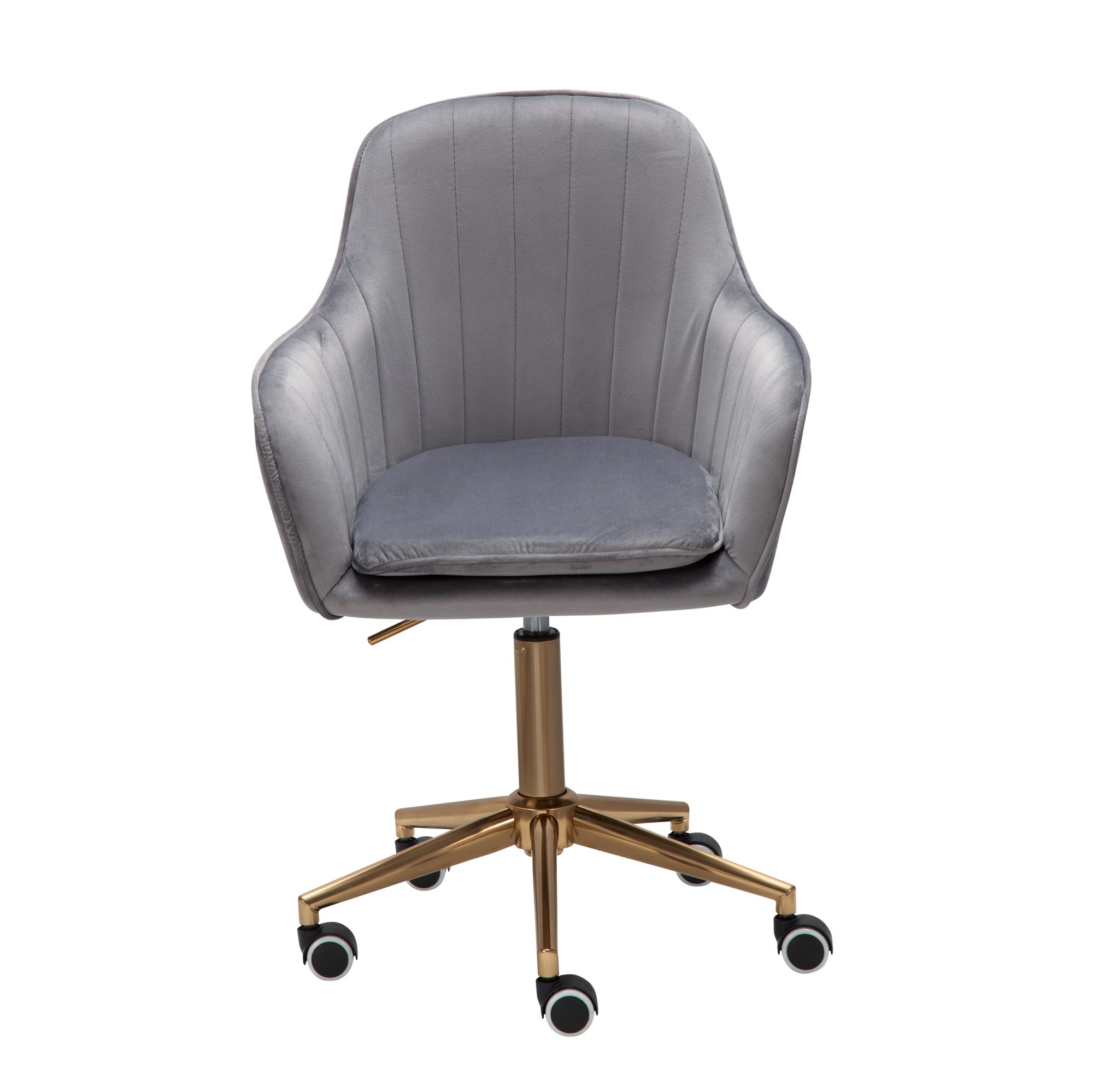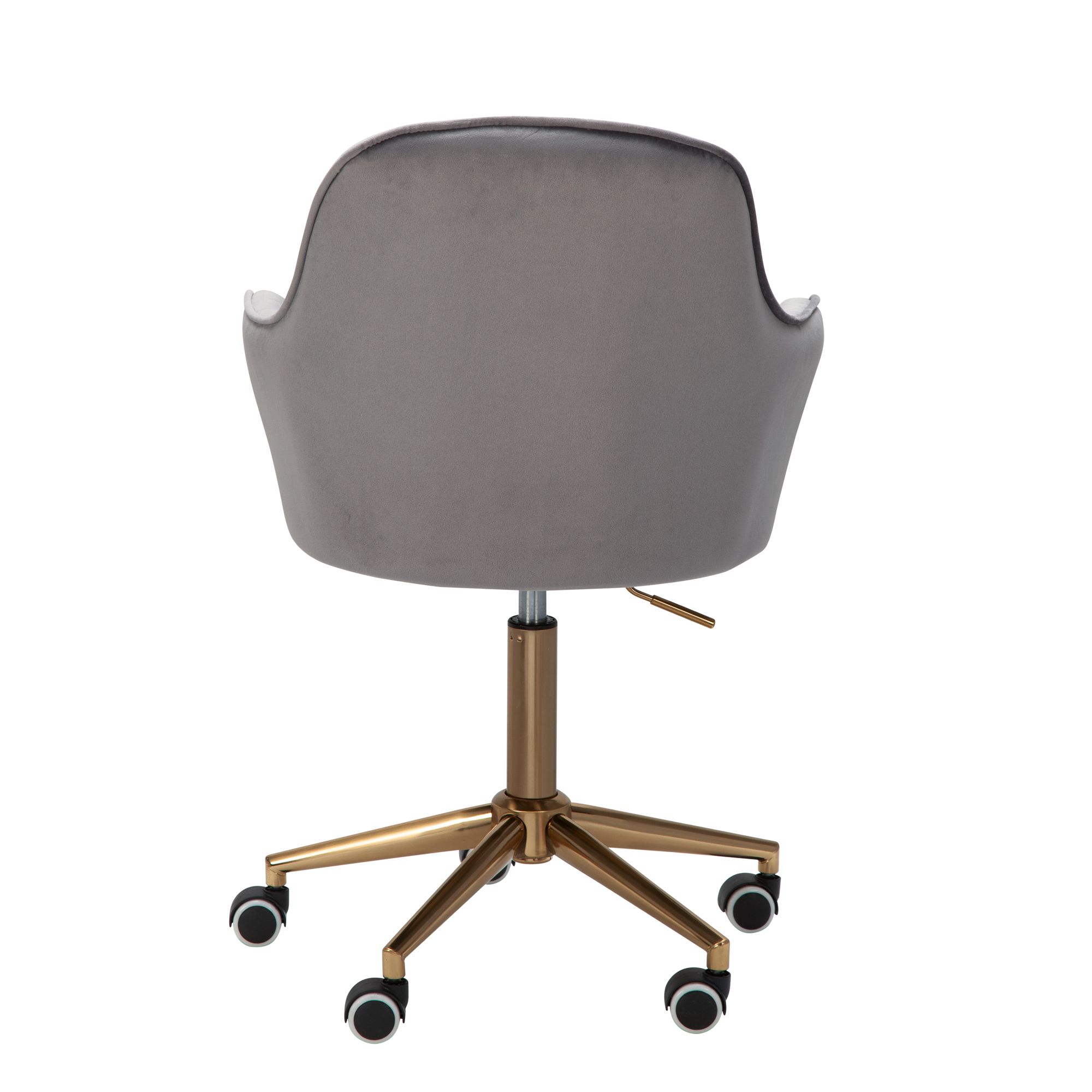Cadeira de escritório moderna em veludo cinza com assento ergonômico para máximo conforto. Base metálica dourada adiciona um toque sofisticado. Ideal para espaços pequenos, ajustável em altura (43-63 cm) e suporta até 120 kg.