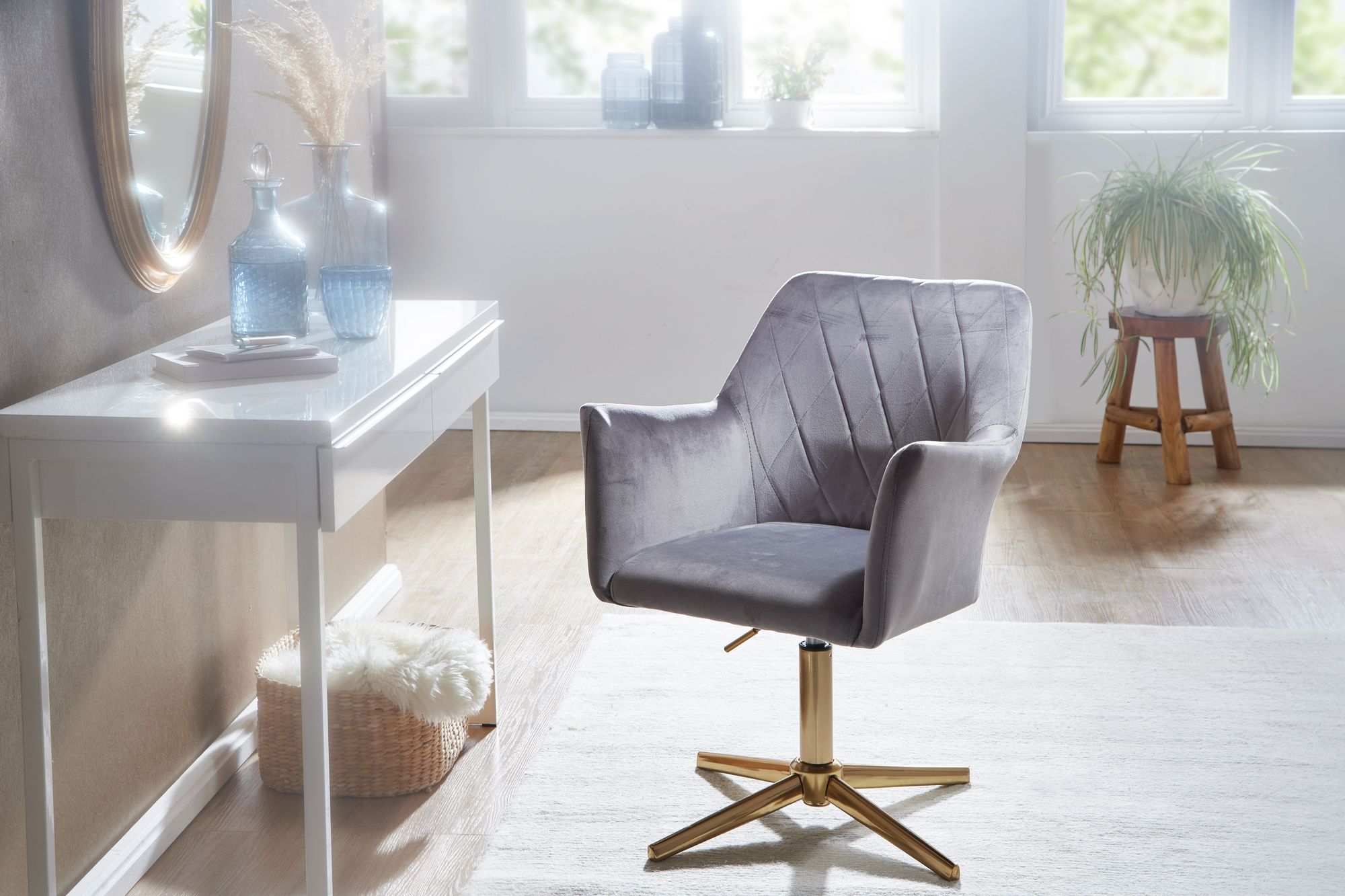 Informações de produto "Cadeira de escritório veludo cinza com braços | Metal dourado | Altura ajustável 80-97 cm"
