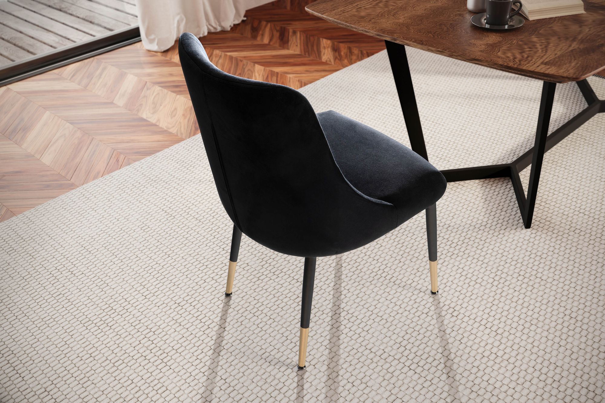 Informações de produto "Cadeira de jantar veludo preto com pernas pretas | 49x56x85 cm | Cadeira moderna estofada"