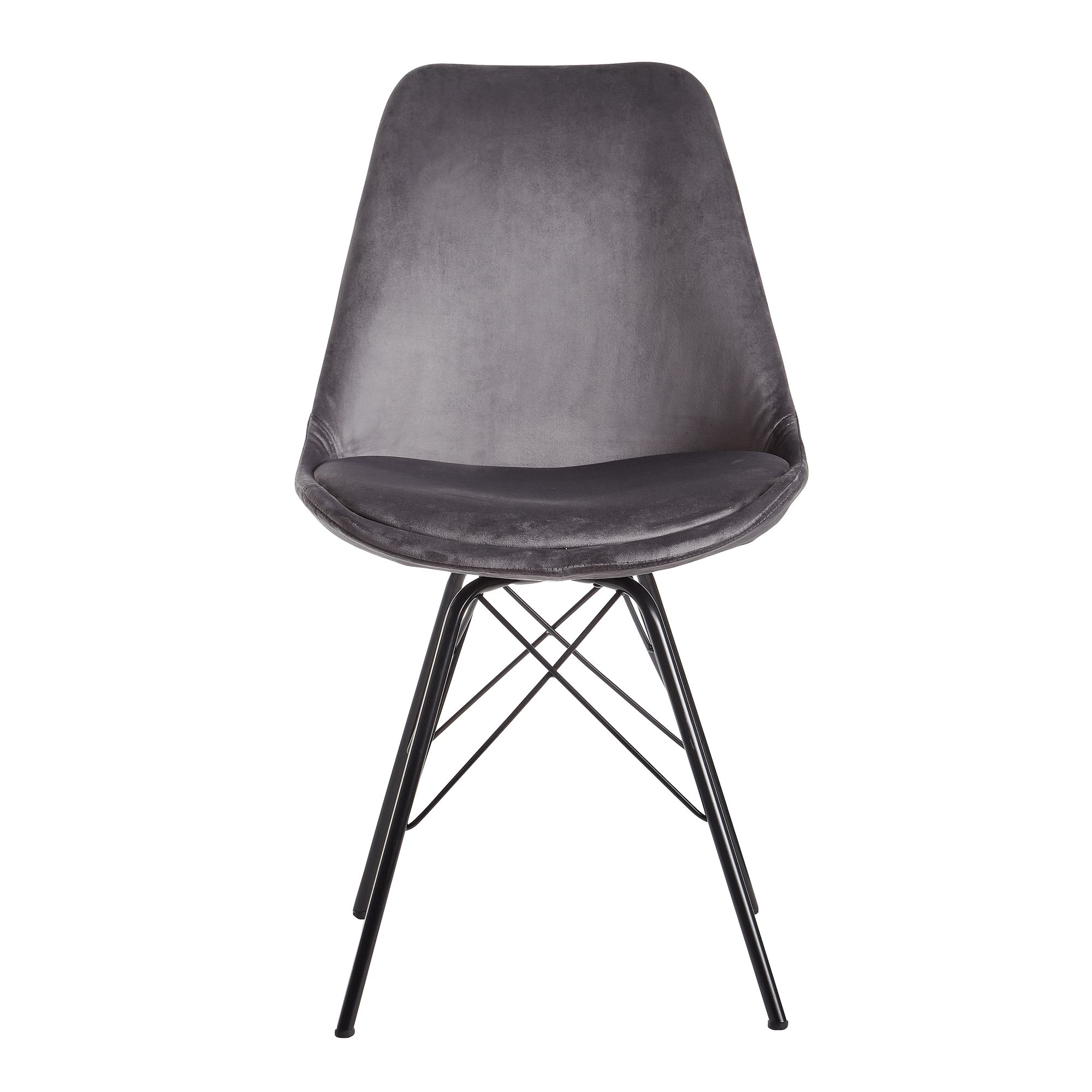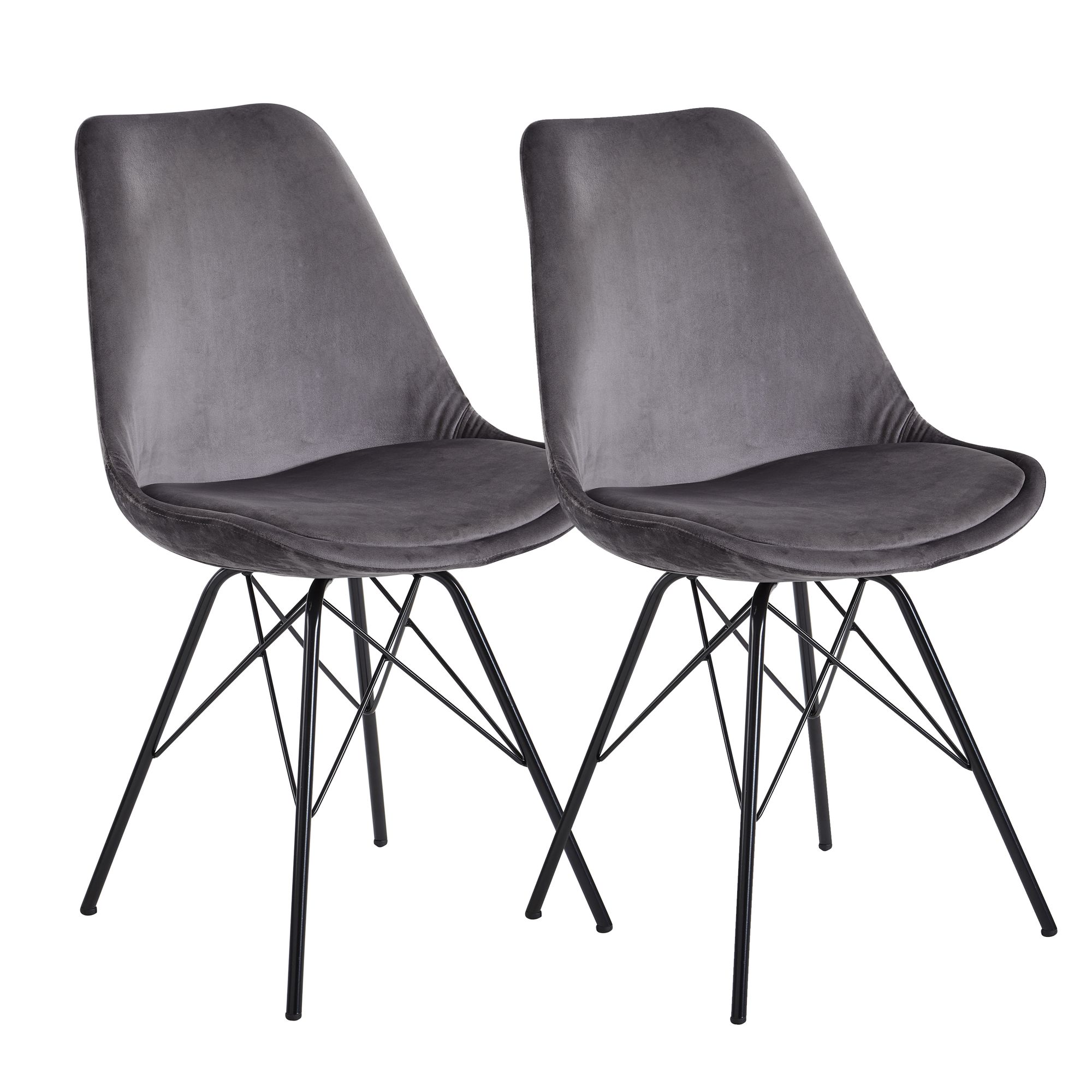 Conheça este conjunto de 2 cadeiras de jantar com design escandinavo moderno que combinam conforto e elegância. Com concha em veludo cinza e assento acolchoado fixo, oferecem excelente suporte para longos períodos. As quatro pernas robustas de ferro lacado preto garantem estabilidade e robustez.