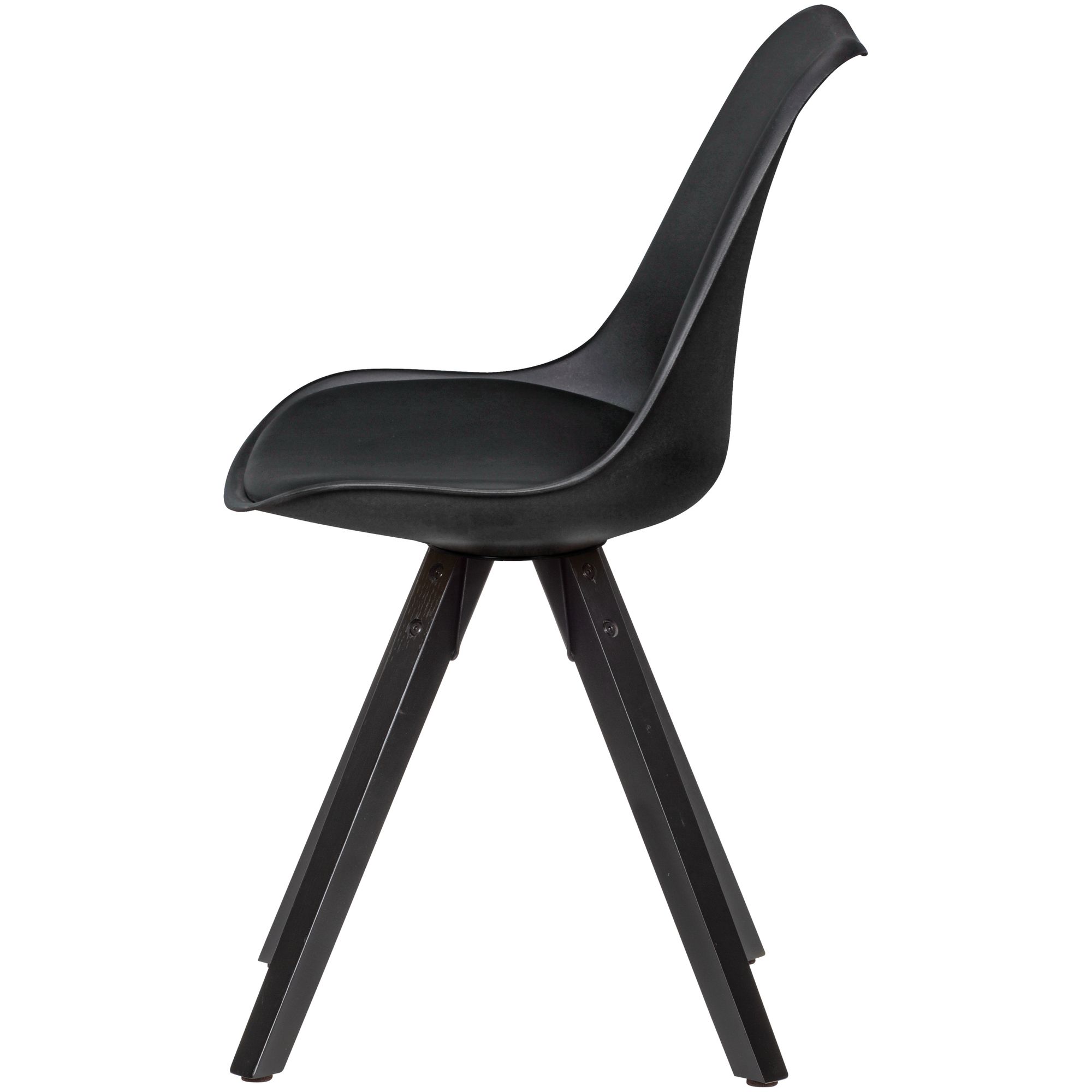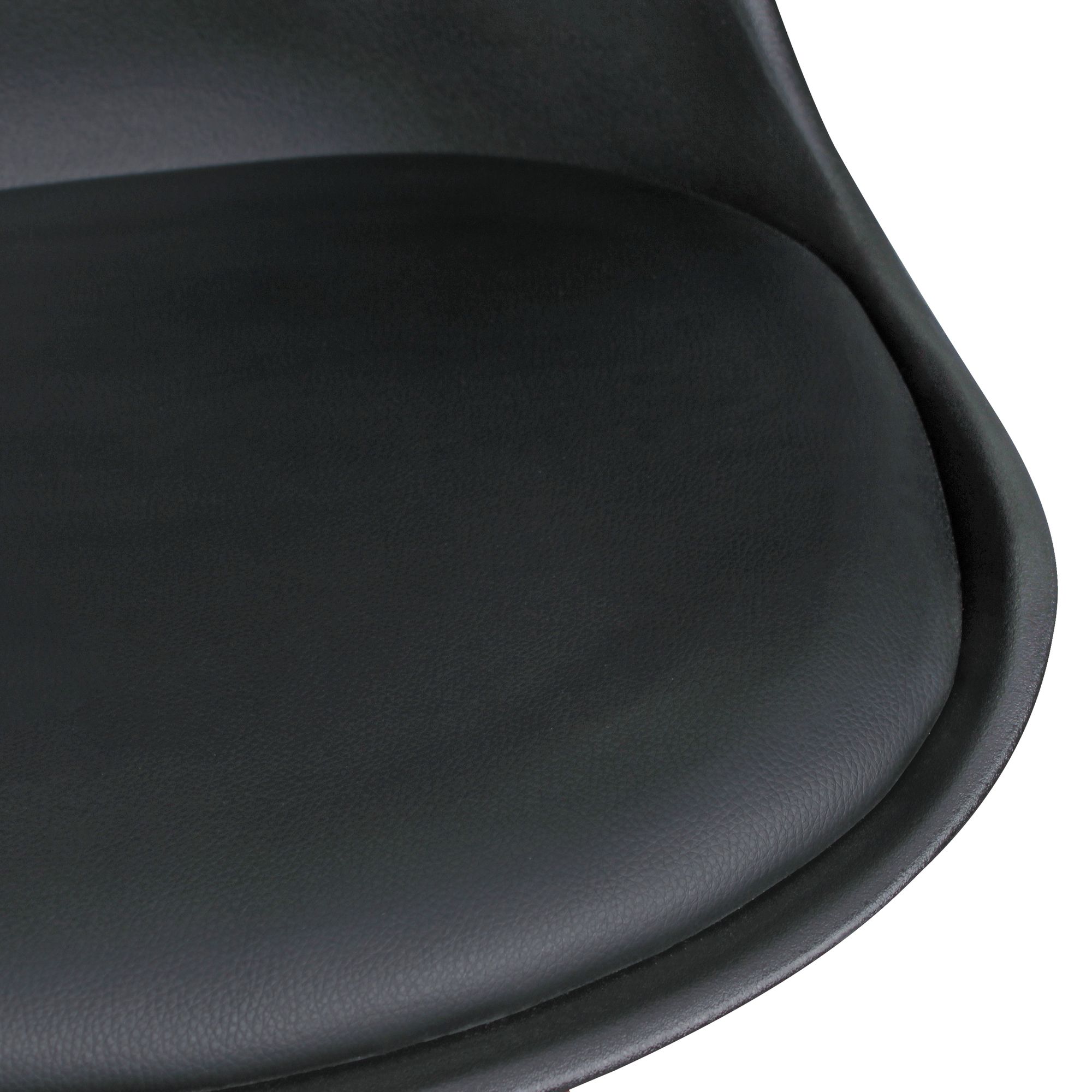 - Materiais: Estofamento em couro sintético, assento e encosto em plástico, pernas de madeira maciça Hevea laqueadas pretas, estrutura metálica pintada a pó
