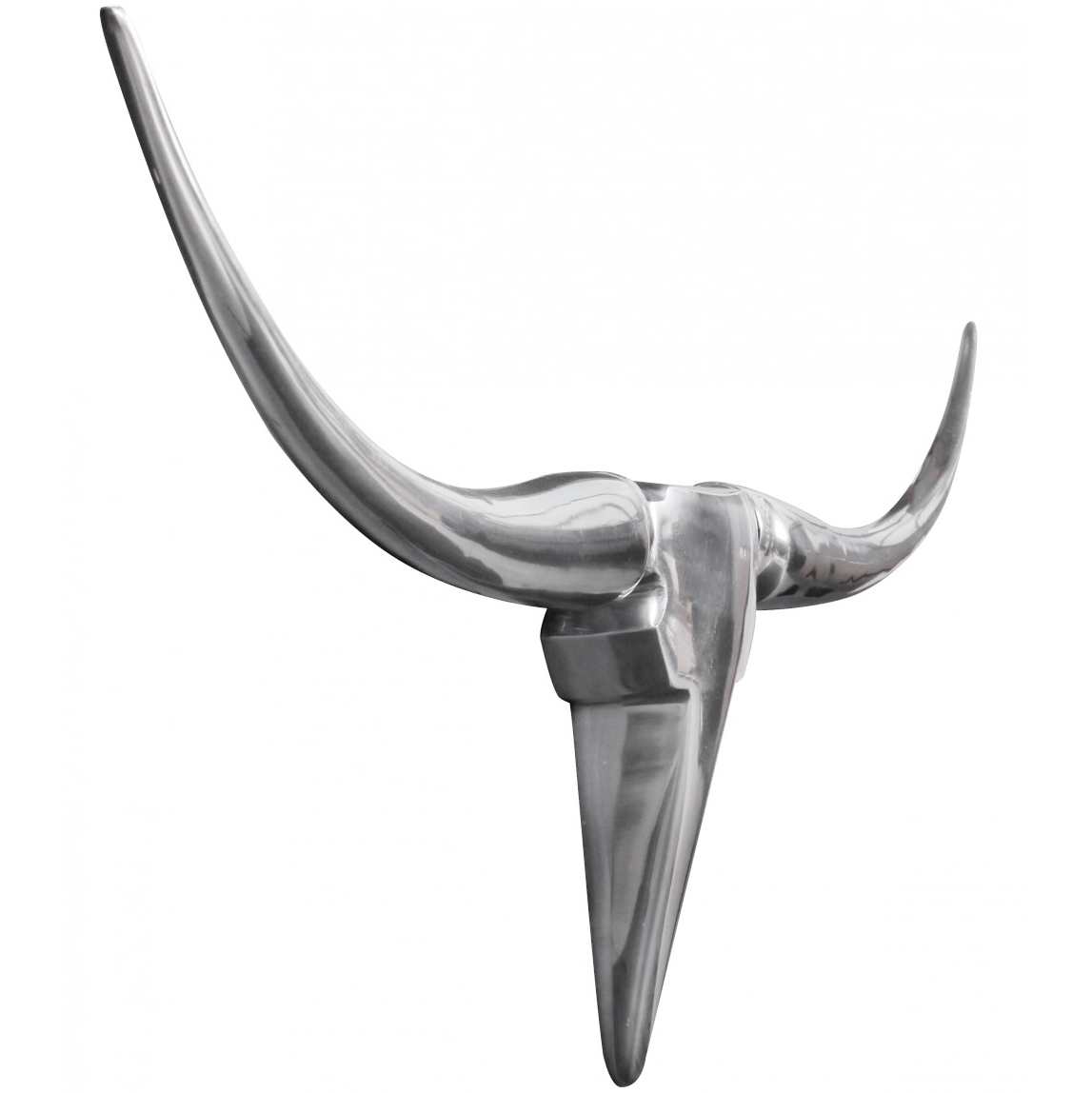 Descubra esta escultura de parede moderna em alumínio prateado com cabeça de touro e dois chifres elegantes. O acabamento polido adiciona um toque distinto à decoração do seu interior.