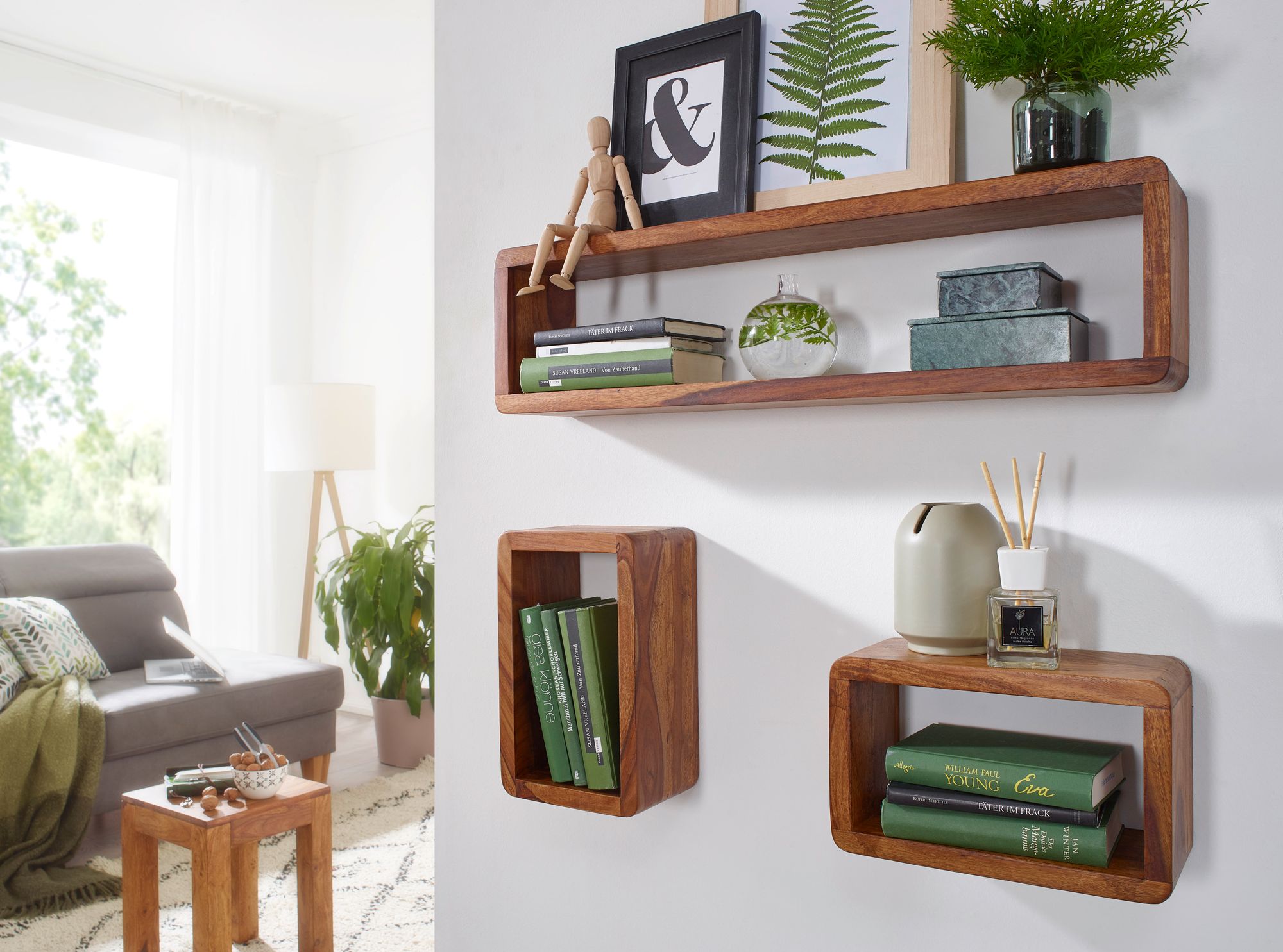 Informações de produto "Conjunto de 3 prateleiras de parede BOHA em madeira maciça Sheesham | Cor natural | 80x20x15 cm, 34x20x15 cm"