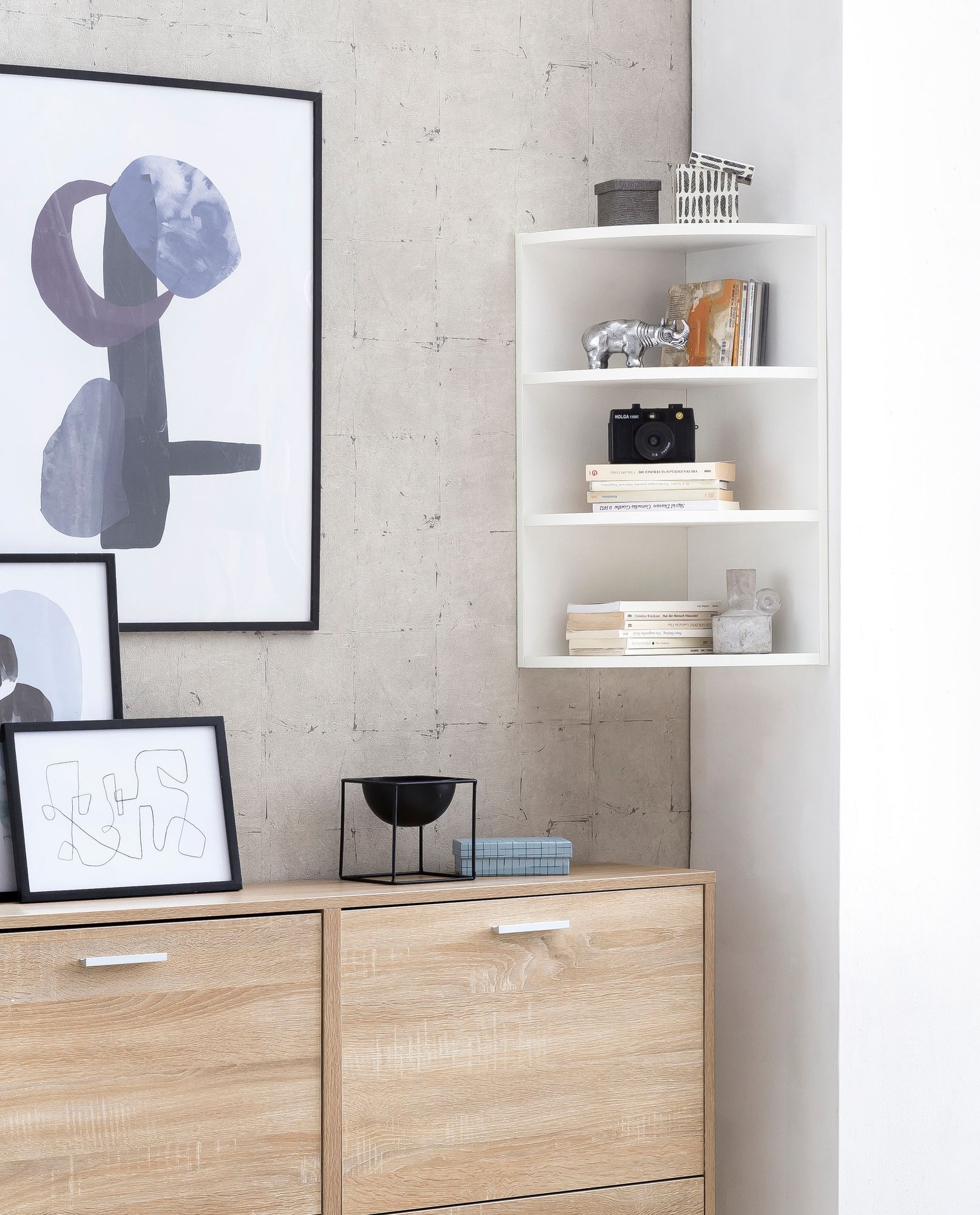 Esta prateleira de canto em madeira branca combina design moderno com funcionalidade, apresentando três prateleiras abertas que oferecem amplo espaço para decorações e itens pessoais. A superfície melaminada é resistente a riscos e água, garantindo durabilidade e estilo.