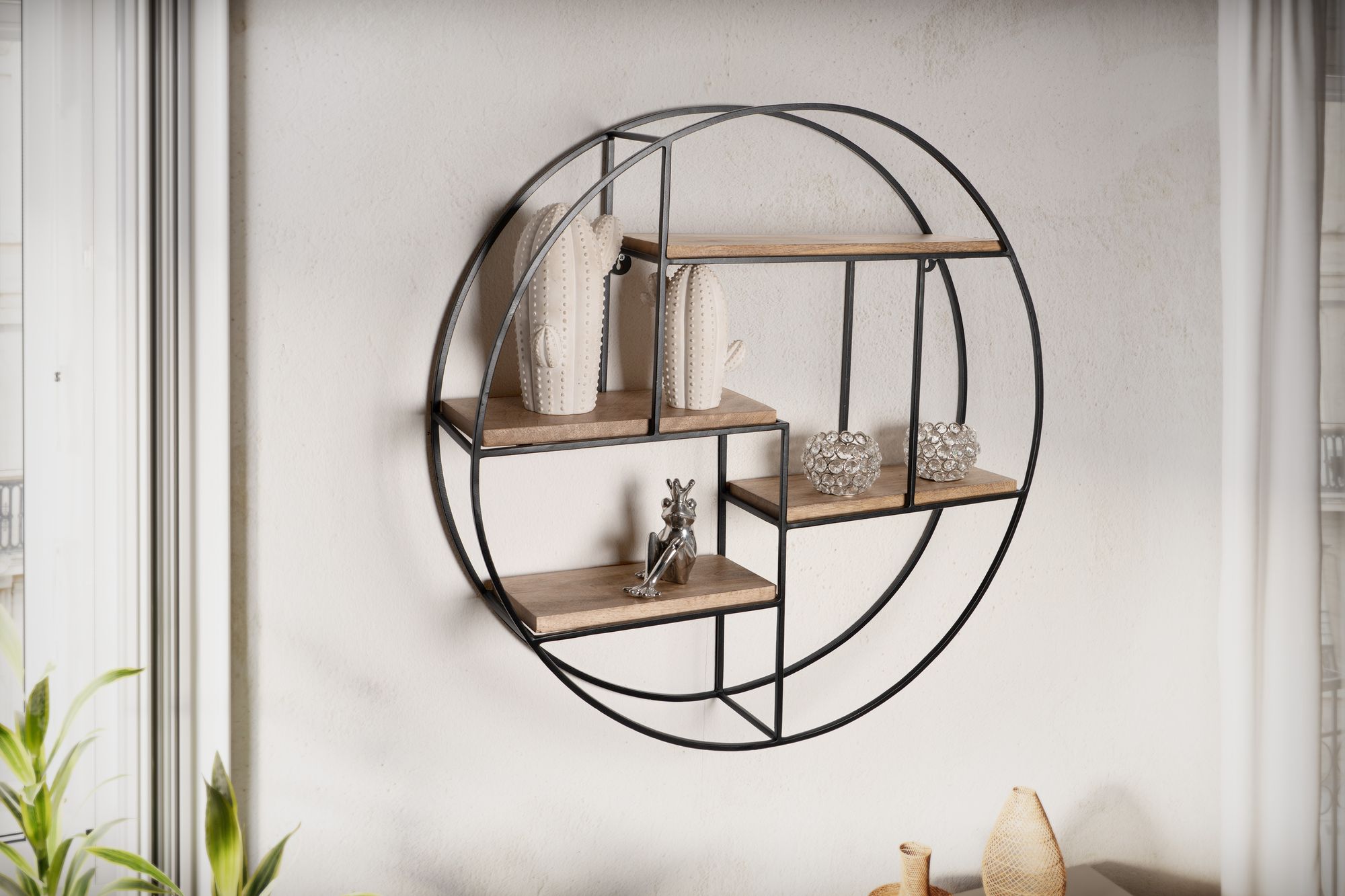 Esta prateleira de parede redonda em estilo industrial moderno combina madeira maciça de manga com metal preto revestido a pó para uma solução de armazenamento elegante e funcional. Apresenta quatro prateleiras para fotos, decorações e plantas pequenas.