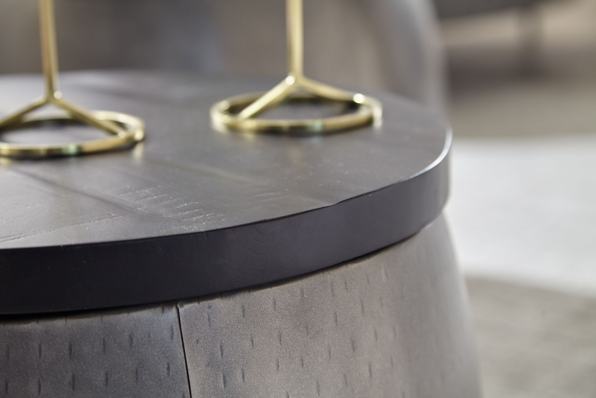Adicione estilo industrial à sua sala com este conjunto de 2 mesas de centro redondas com design cuidado. Os tampos são de madeira maciça de manga reciclada lacada a preto, apoiados em estruturas metálicas prateadas, combinando durabilidade e estética refinada.