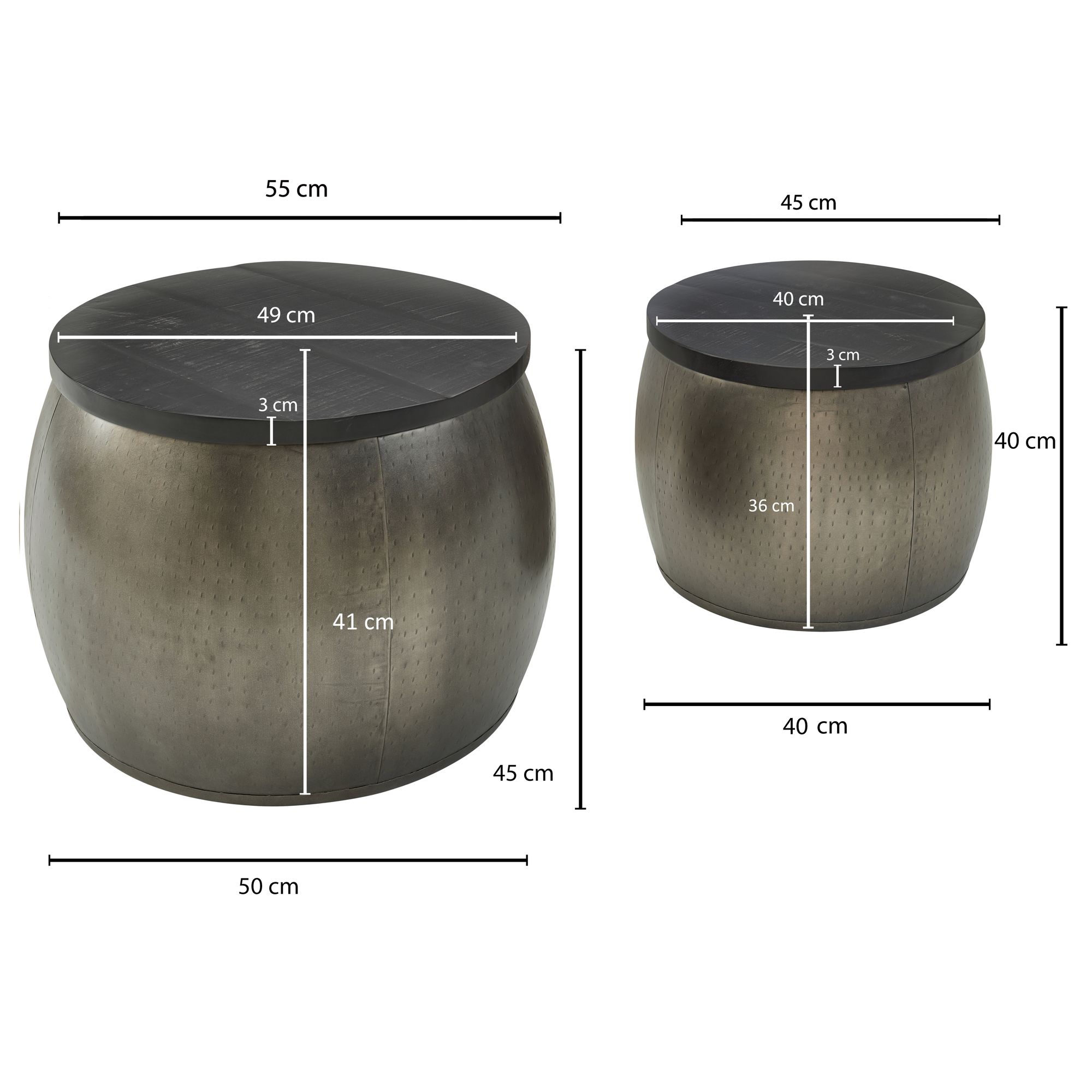 Informações de produto "Conjunto 2 Mesas de Centro de Manga Madeira Maciça Preto 55/45x45/40x55/45 cm | Metal Prateado Industrial | Redondo com arrumação"