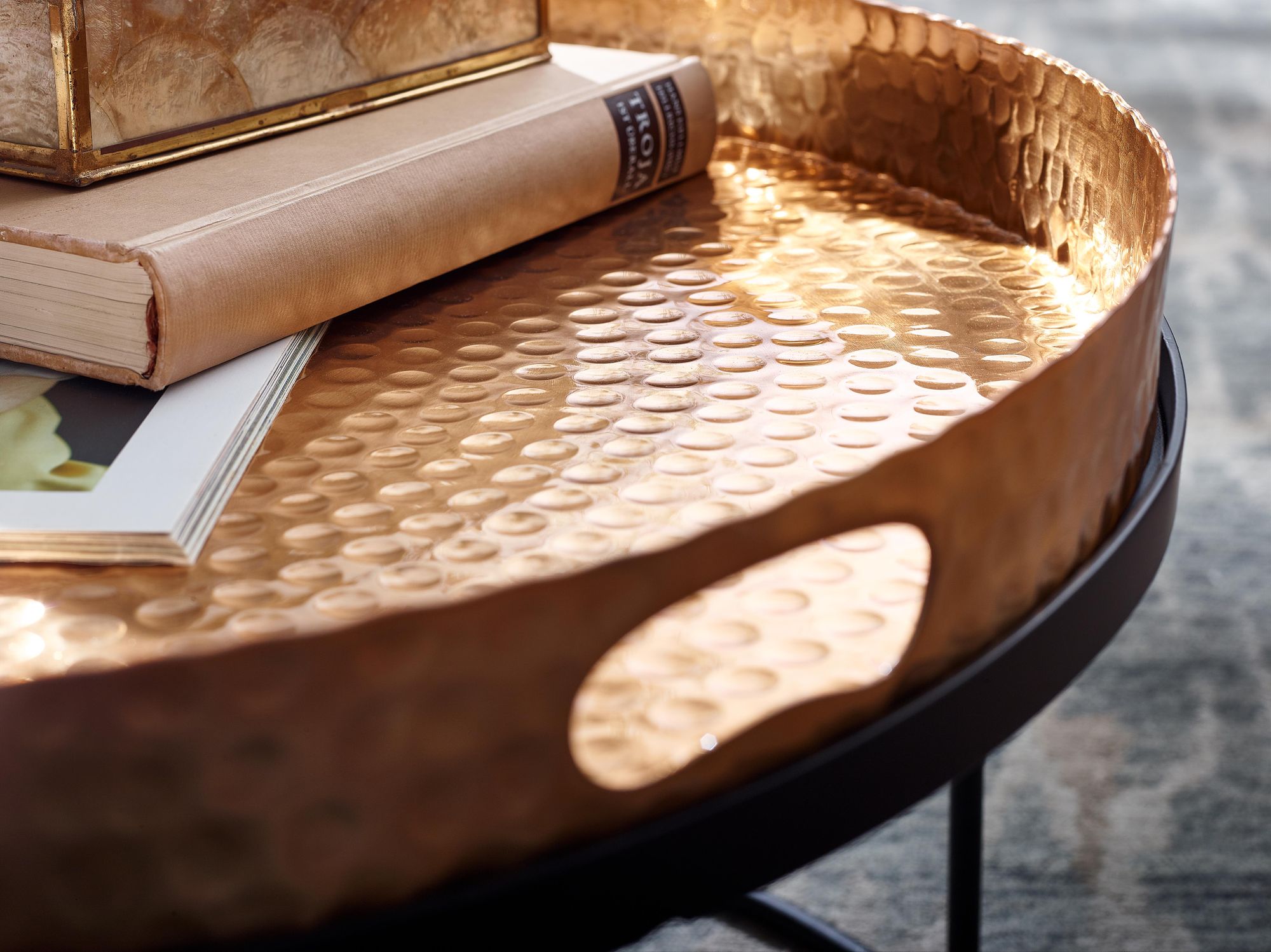 Eleve o estilo da sua sala com este conjunto de 2 mesas de centro redondas em metal dourado e preto. As superfícies em alumínio lacado dourado apresentam uma textura martelada para um visual contemporâneo e refinado. As estruturas em aço preto oferecem resistência e durabilidade.
