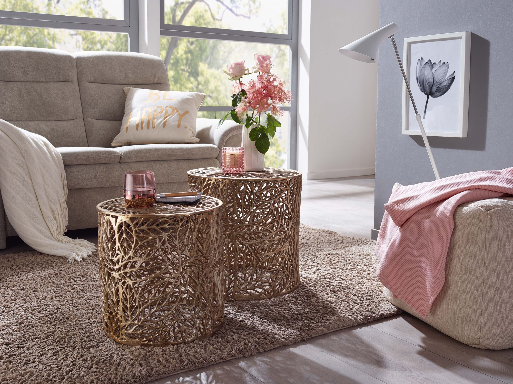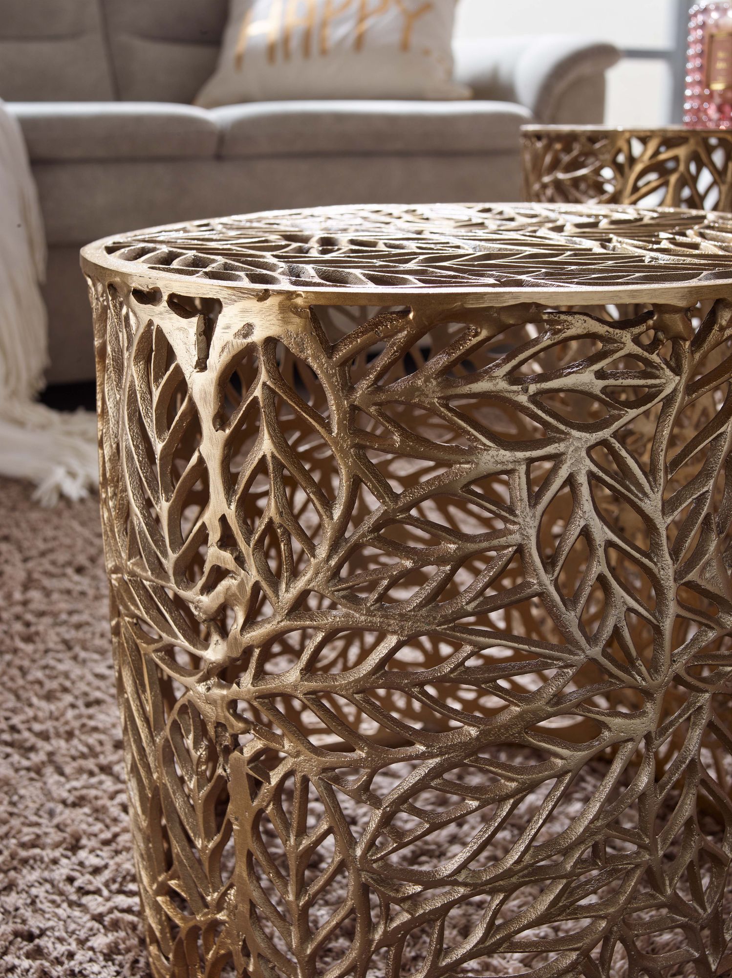 Escolha este conjunto de 2 mesas laterais em alumínio dourado que combina elegância e funcionalidade. Cada mesa apresenta um design floral esculpido no metal, proporcionando um toque moderno e sofisticado ao ambiente.
