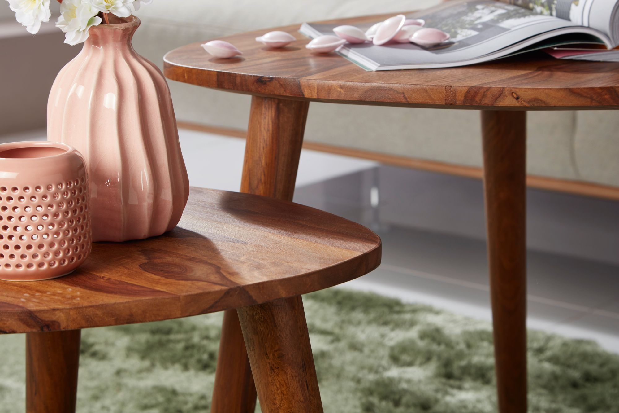 Informações de produto "Conjunto de 2 mesas auxiliares em madeira maciça Sheesham | Cor madeira natural | Dimensões 60x54x60 cm e 42,5x45x42,5 cm"