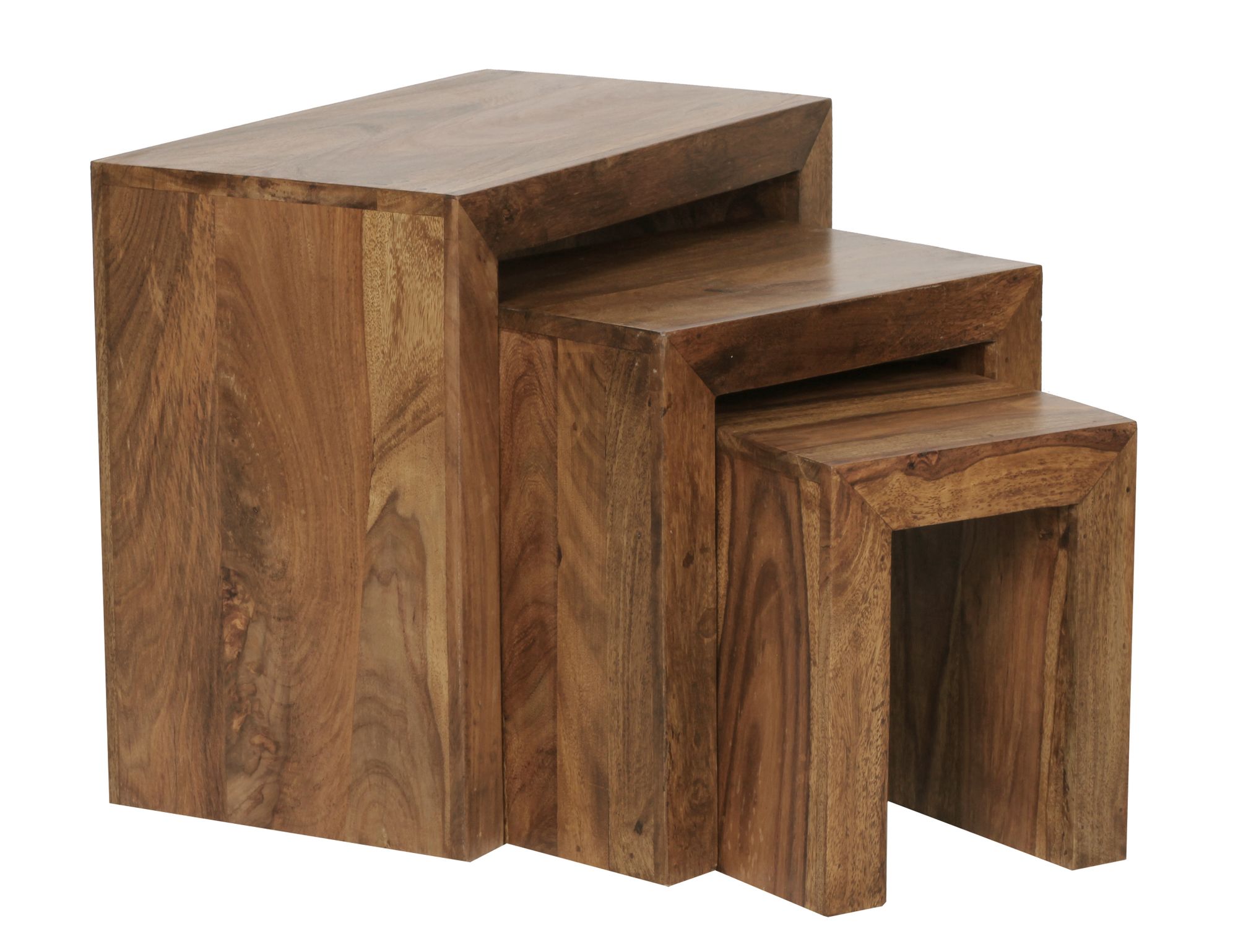 Conheça este conjunto de 3 mesas aninhadas em madeira maciça Sheesham cor castanho escuro, ideal para uma sala de estilo campestre. O acabamento natural realça a textura única da madeira, tornando cada mesa uma peça artesanal exclusiva.