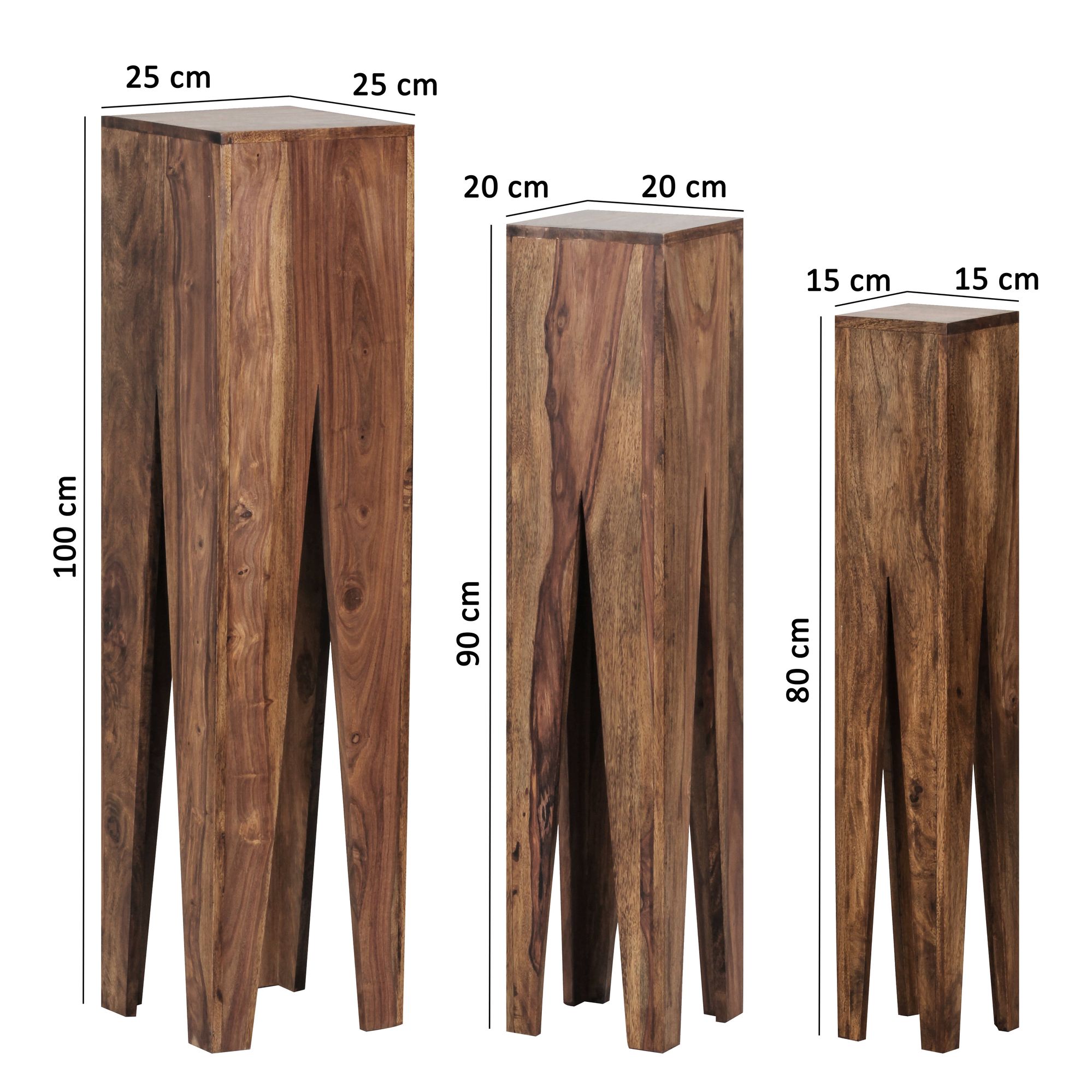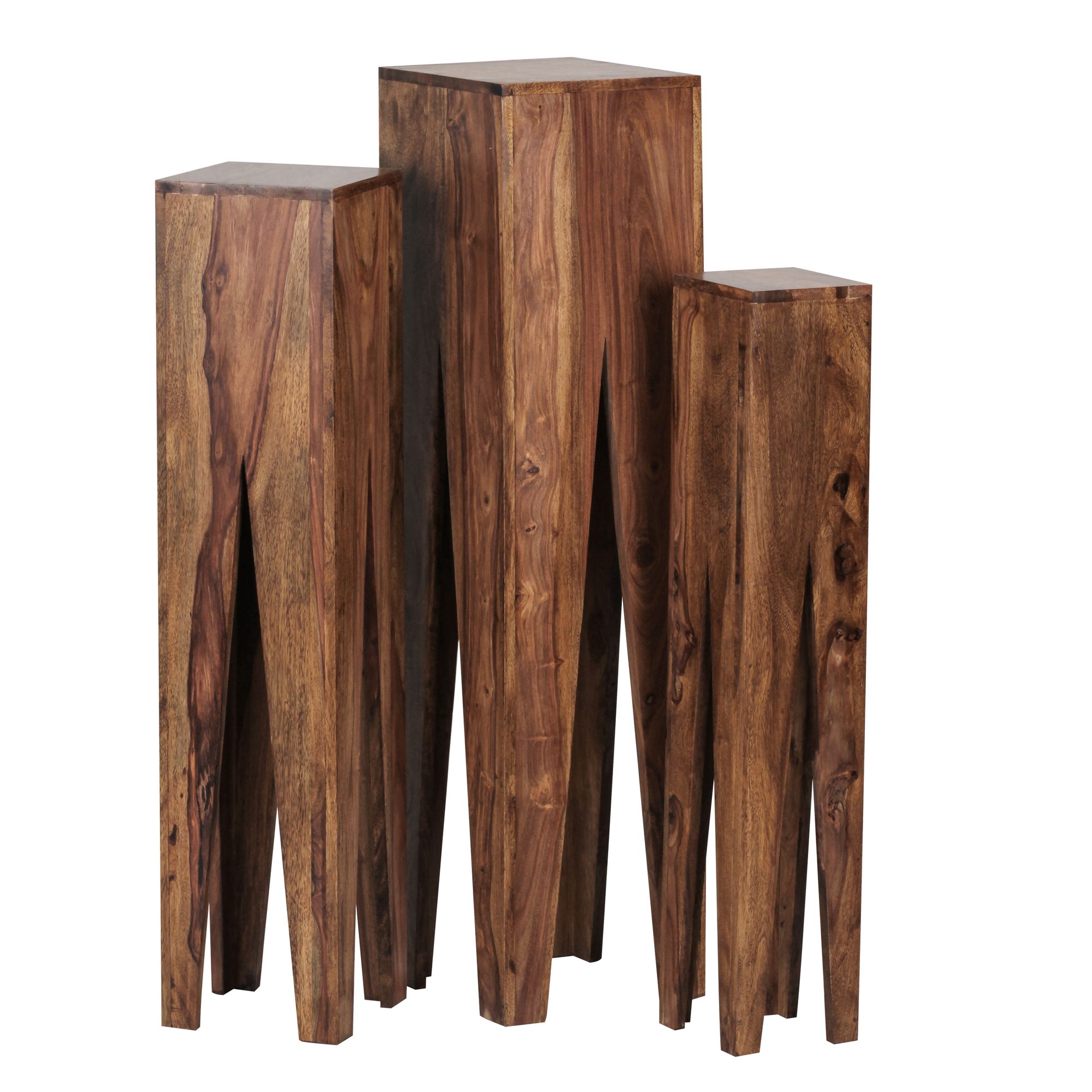 Este conjunto de 3 mesas laterais em madeira maciça Sheesham castanha combina funcionalidade e elegância moderna com design quadrado e pernas em forma de coluna. Ideal para exibir objetos decorativos, cada mesa é uma peça artesanal única.