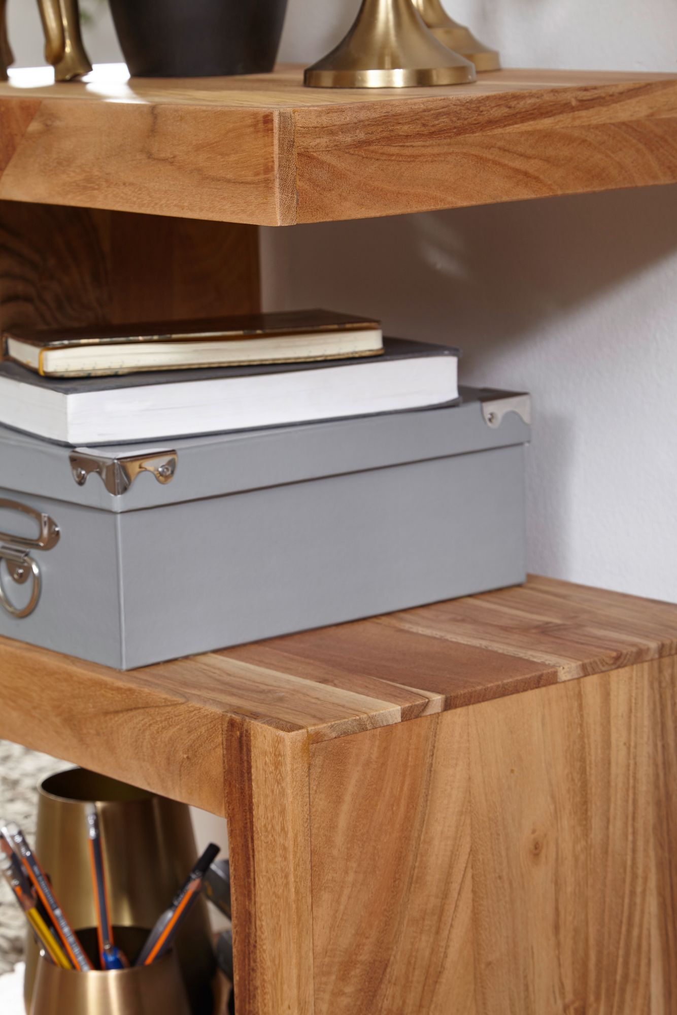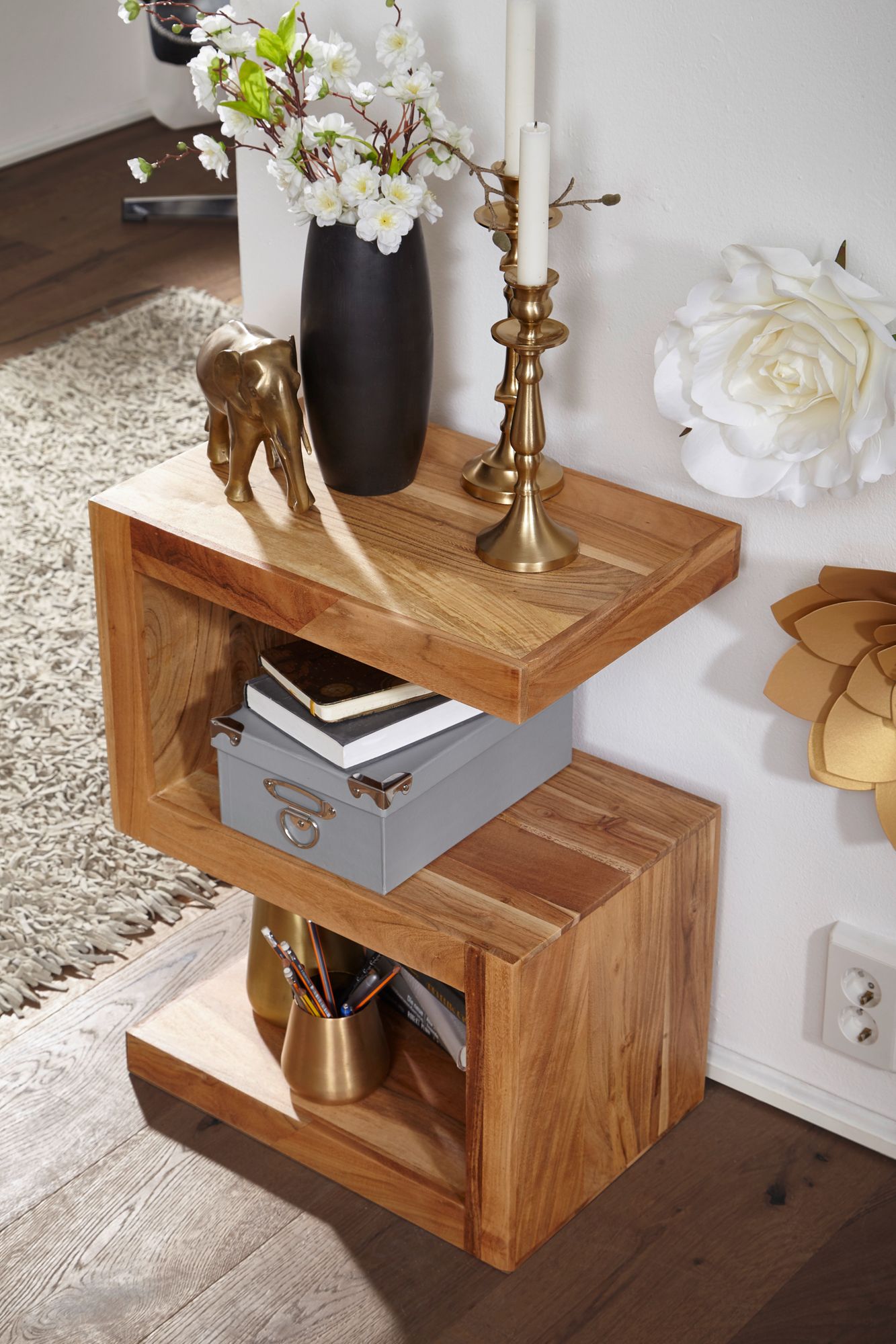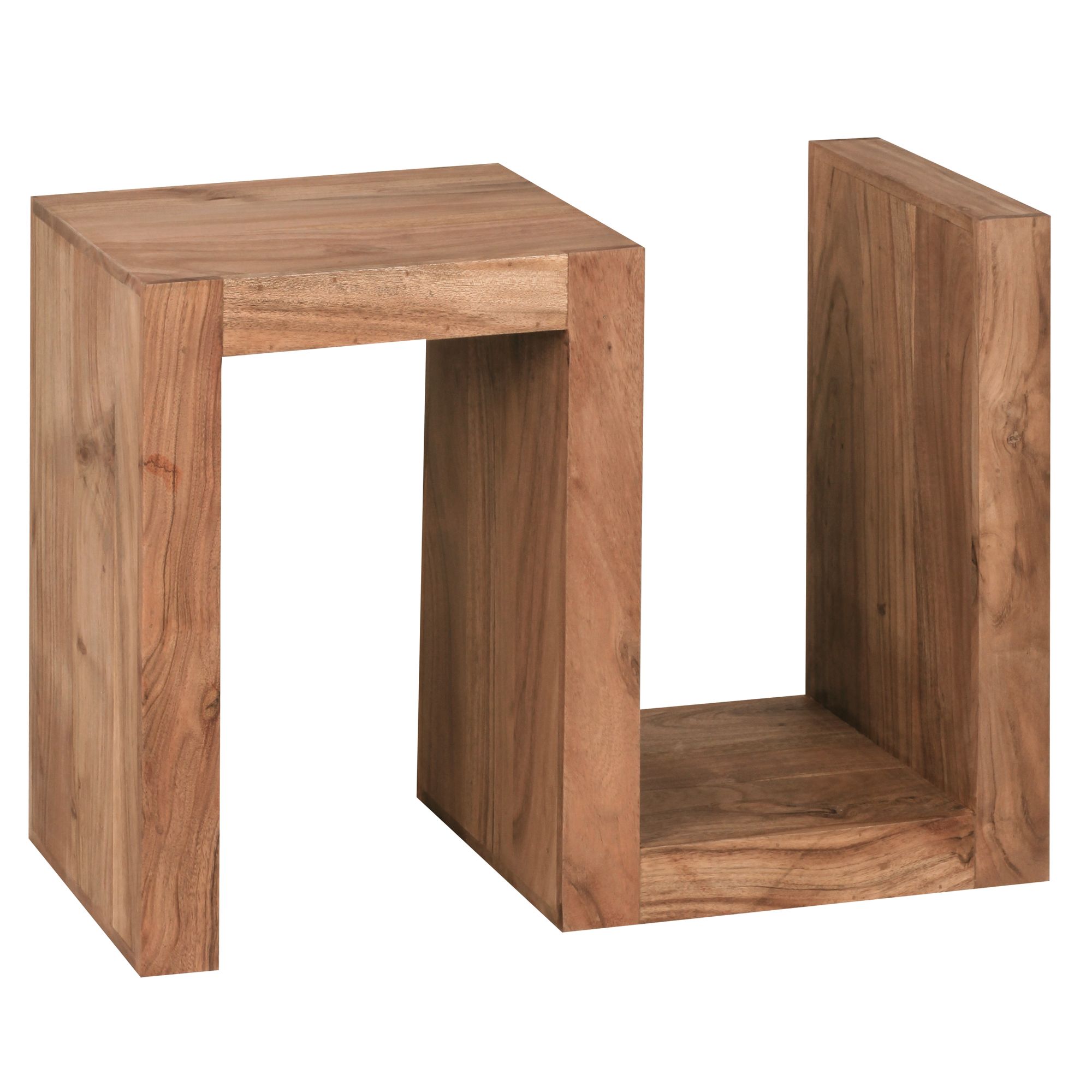 Conheça a mesa lateral MUMBAI em madeira maciça de acácia, com 60 cm de altura, ideal para sua sala de estar. O design exclusivo em forma de S cria espaços adicionais para armazenar revistas ou objetos decorativos.