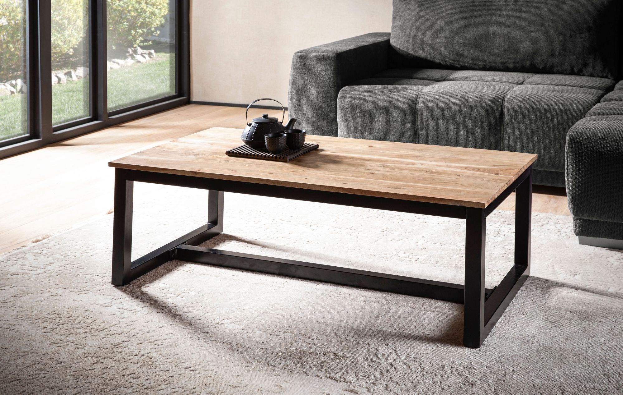 Adicione um toque industrial e natural à sua sala com esta mesa de centro em madeira maciça de acácia. A superfície em tom castanho claro é destacada por uma estrutura robusta em metal preto, criando um equilíbrio estético e funcional.
