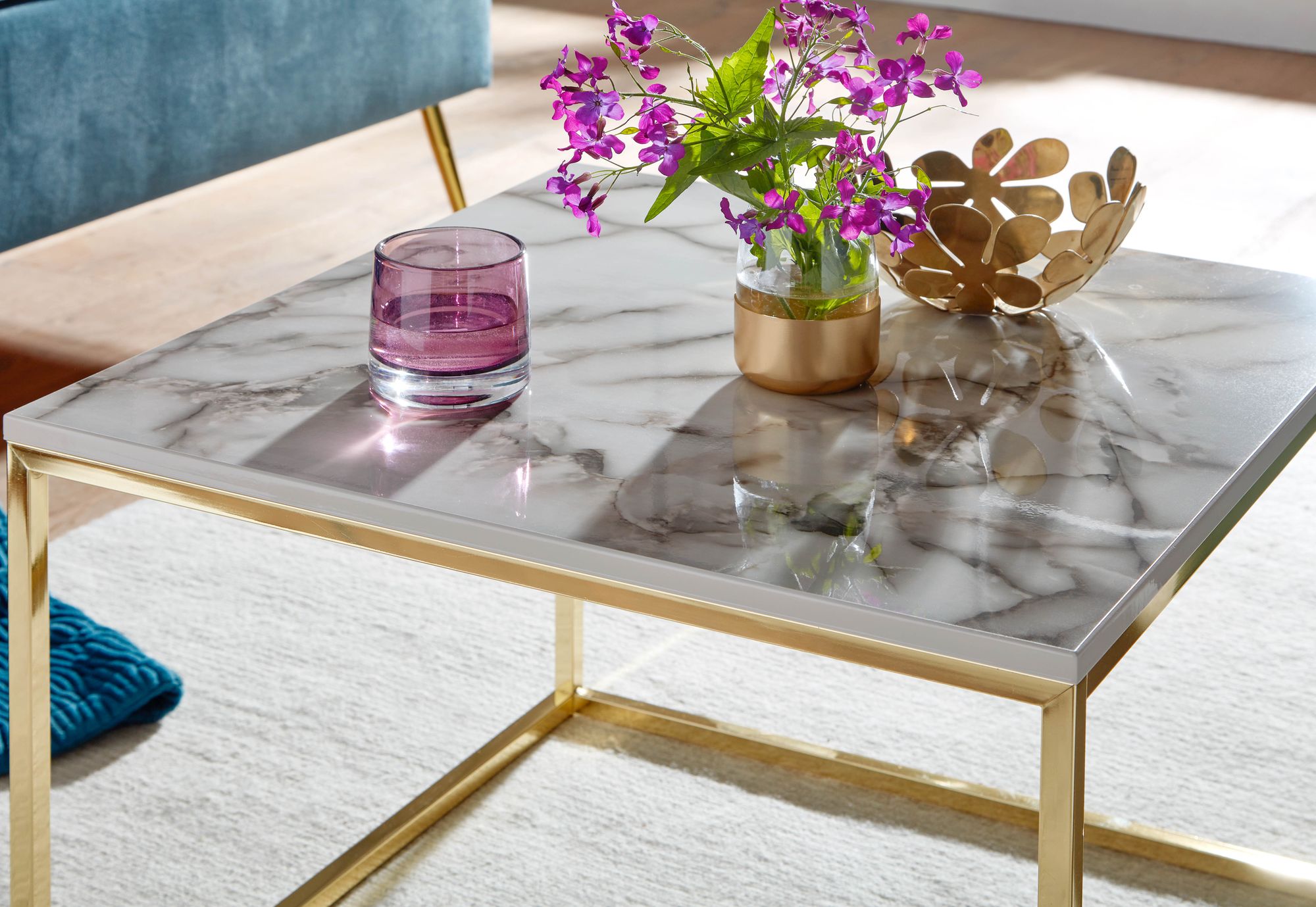 Mesa de centro 60x60x45 cm | Tampo efeito mármore branco | Estrutura metálica dourada