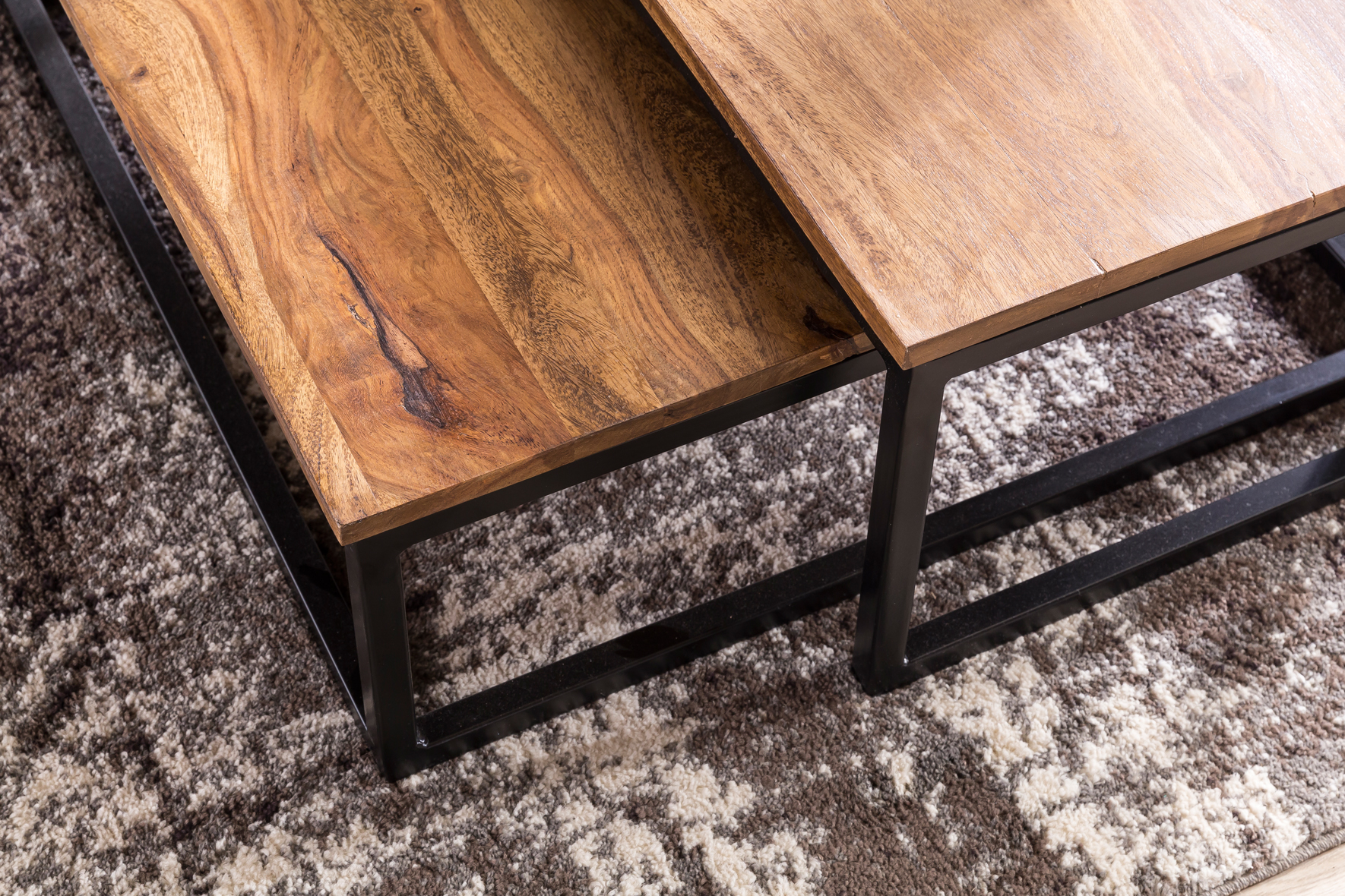 O conjunto de mesas de centro AKOLA de 2 peças combina design industrial com materiais duráveis para valorizar sua sala. Feitas artesanalmente em madeira maciça de Sheesham com acabamento vernizado PU, garantem durabilidade e fácil manutenção. As pernas em metal preto fosco oferecem estabilidade e estilo moderno.